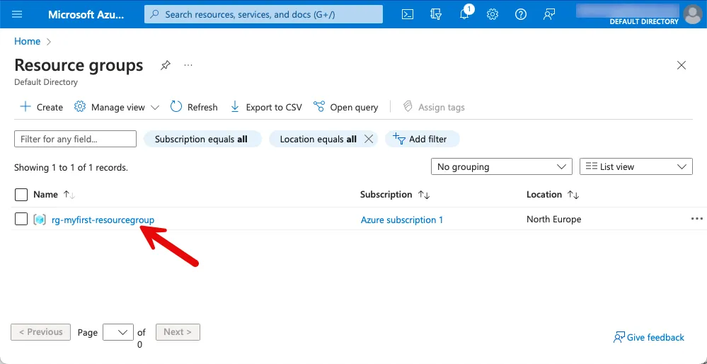 Creating the resource group takes a few seconds. I then navigate to the resource group by clicking on the object: