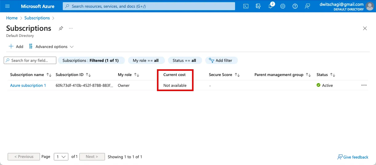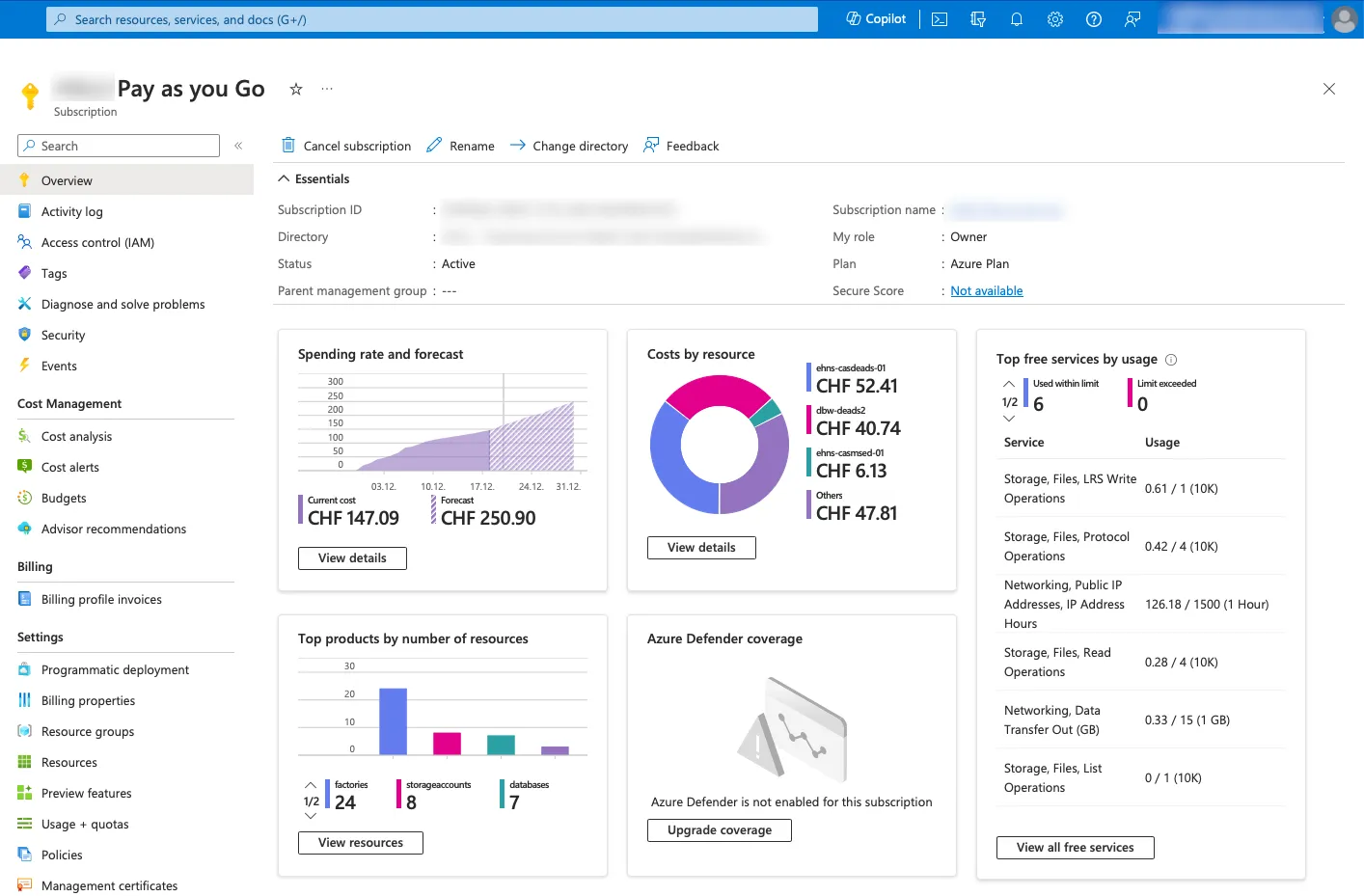 The running costs are displayed directly in the overview. However, the costs are not displayed in real time, but with a delay of a few hours. However, as the subscription is relatively new, it is not surprising that no costs have been displayed yet. For this reason, here are a few screenshots of another subscription that I work with.