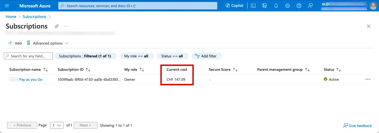 To ensure that costs do not get out of hand, you should always look at the current costs so that you know which resources are causing how many costs. Based on this, you can consider optimizing certain resources. The list of the corresponding costs can be viewed on the subscription itself.