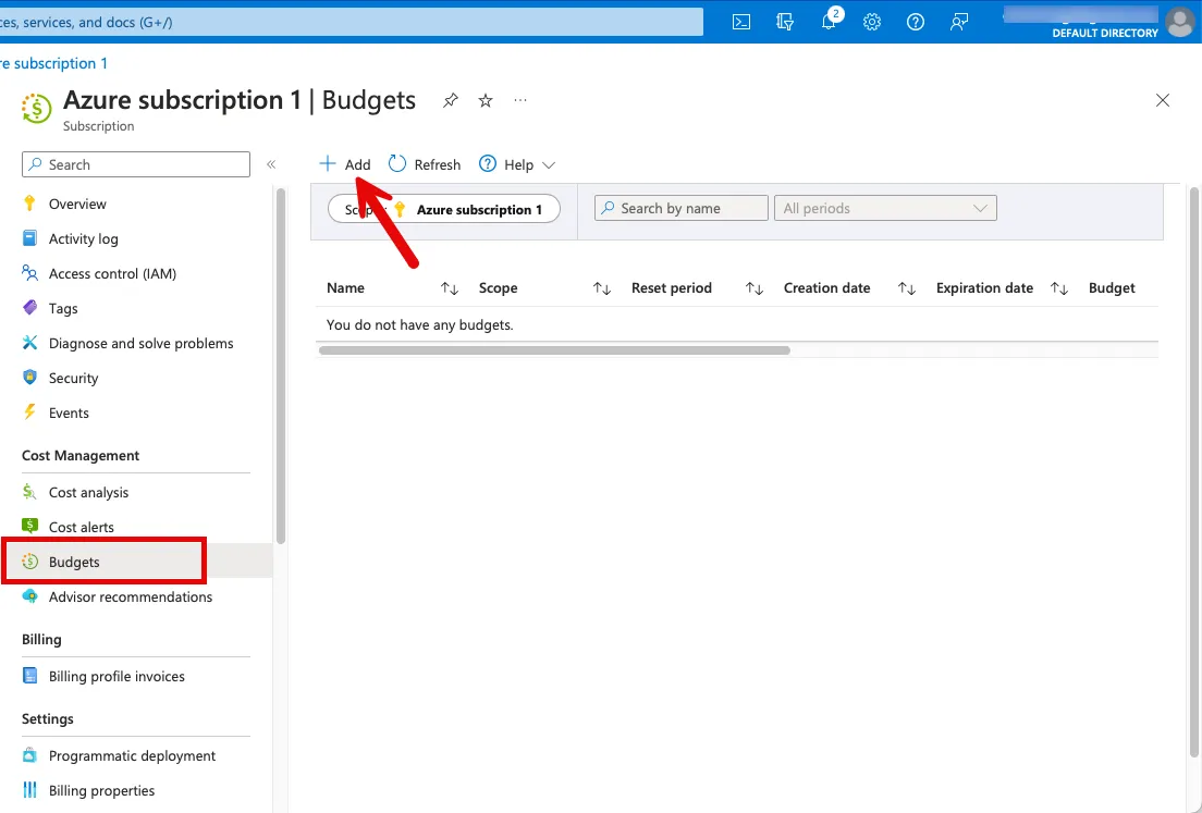On the subscription, click on “Budgets” in the menu and add a new one.