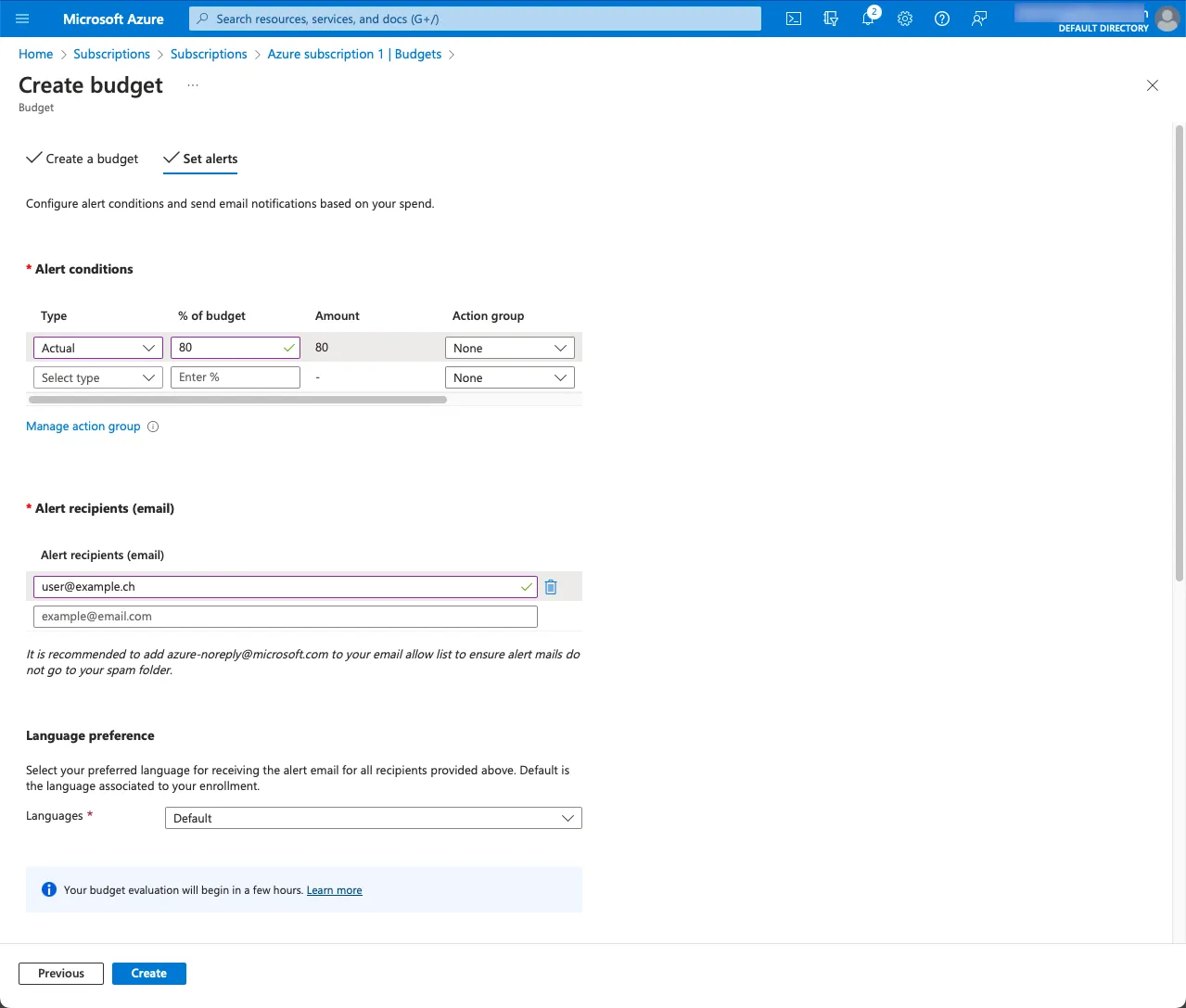 Of course you want to receive a message before the budget is reached, you can set this under alarm conditions. I set a threshold value of 80%, which means that when my spending reaches CHF 80, I receive a message by e-mail.