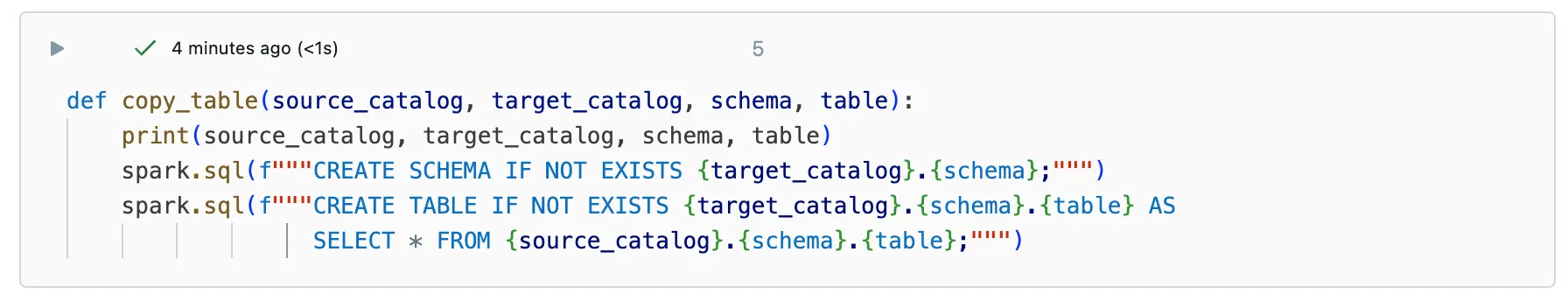 Next, I wrote a function that I can call in a for loop for each individual table. To do this, the source catalog, target catalog, schema and table name must be passed. In the function itself, the schema is first created if it does not exist and then the new table is created with a “CREATE TABLE AS SELECT” statement.