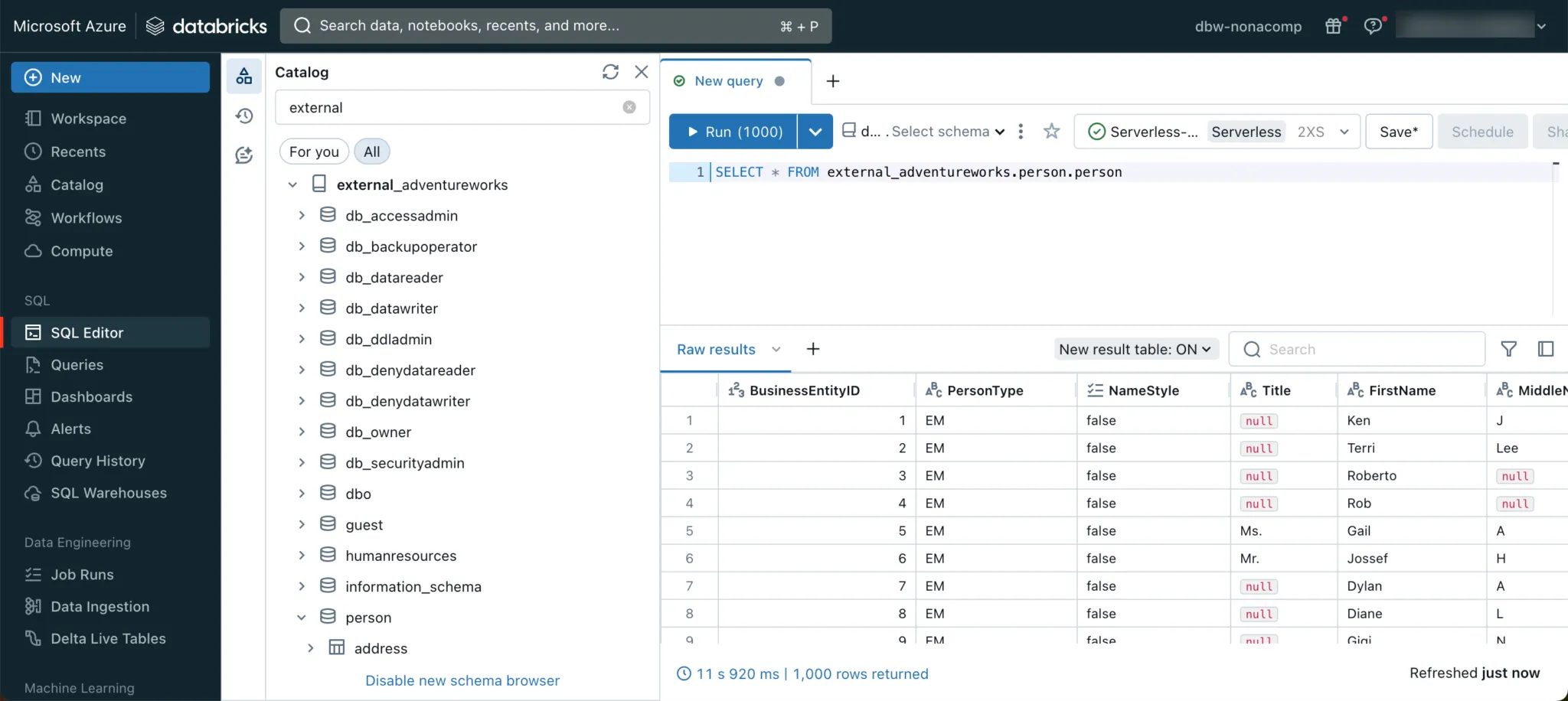 With this setup, you can address the external source directly within Databricks Lakehouse. For example, I have queried the person.person table from the AdventureWorks DB.