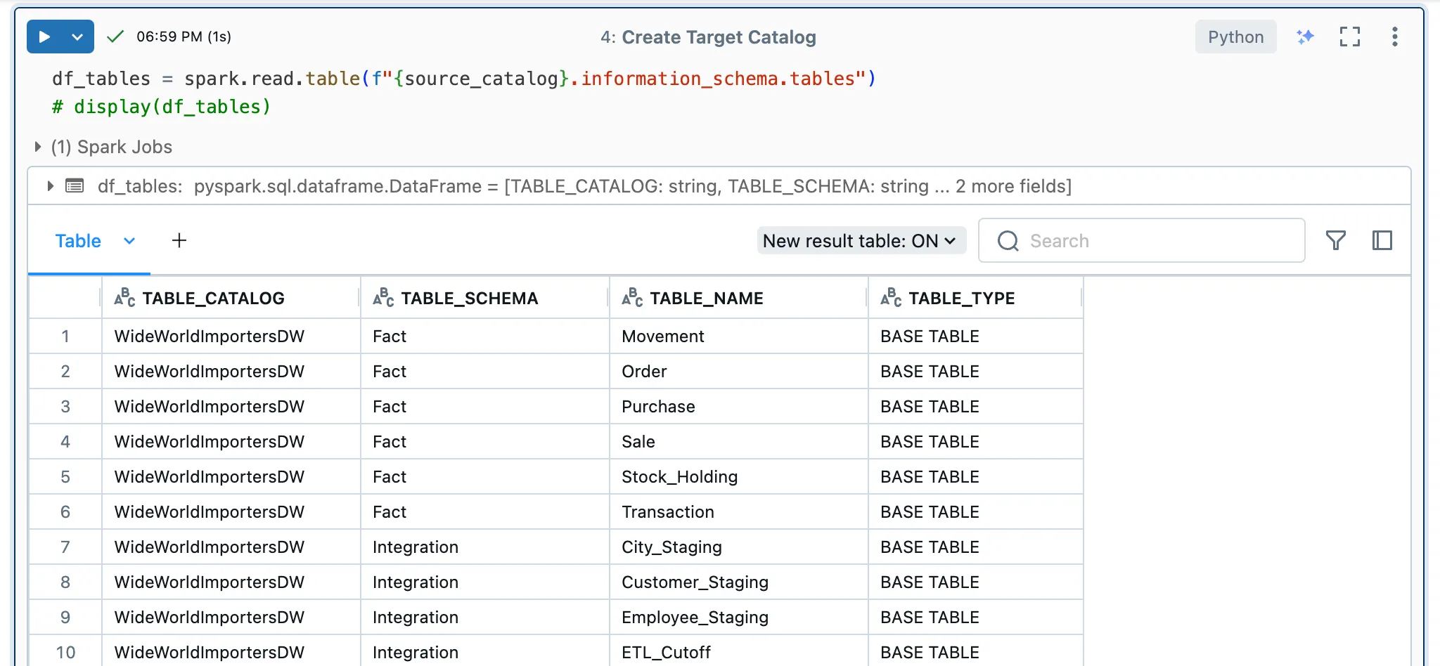 So that I can iterate over all source tables, I read them from the information schema of the source and save the tables in a dataframe.
