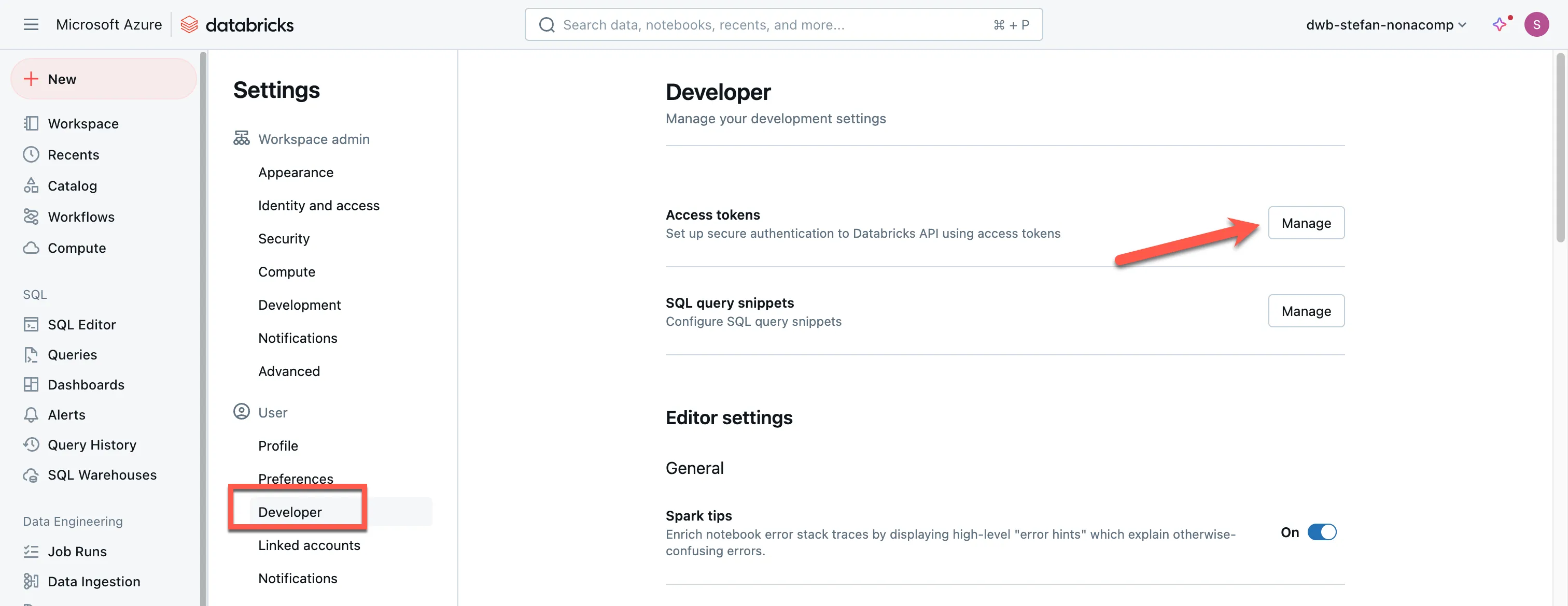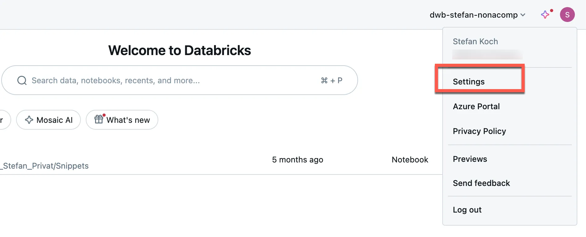 In the Databricks workspace, you can click on the user’s icon, which is located at the top right.