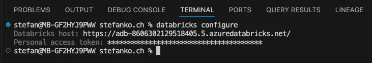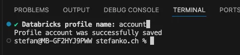 Now, I configure the Databricks CLI by typing the following command in the terminal. I usually use the integrated Visual Studio Code terminal.
