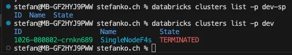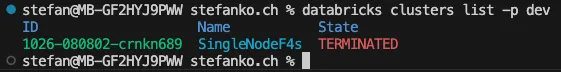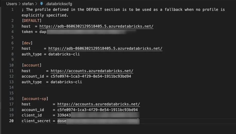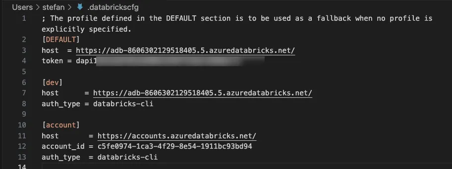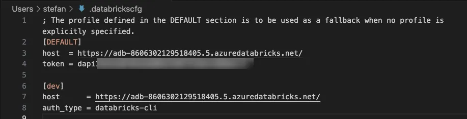 During the process, you are asked for a profile name, for which I have chosen “dev.” You can log in to different Databricks workspaces with these different profile names. The content of the .databrickscfg file then looks like this: