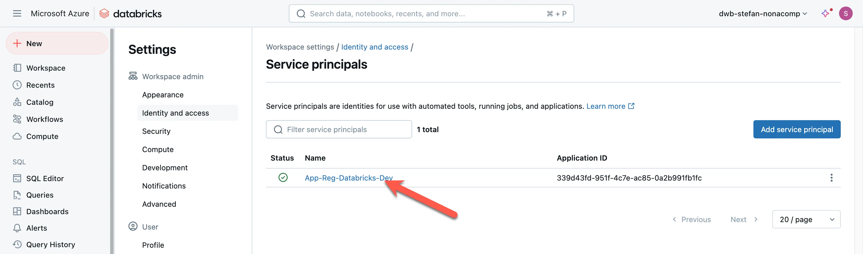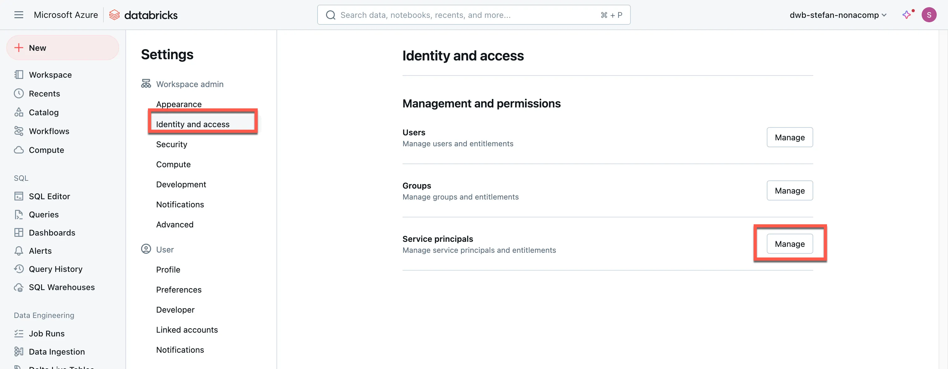 Now I switch to the Databricks Workspace, go to Settings, “Identity and access,” and click Manage for the Service Principals.