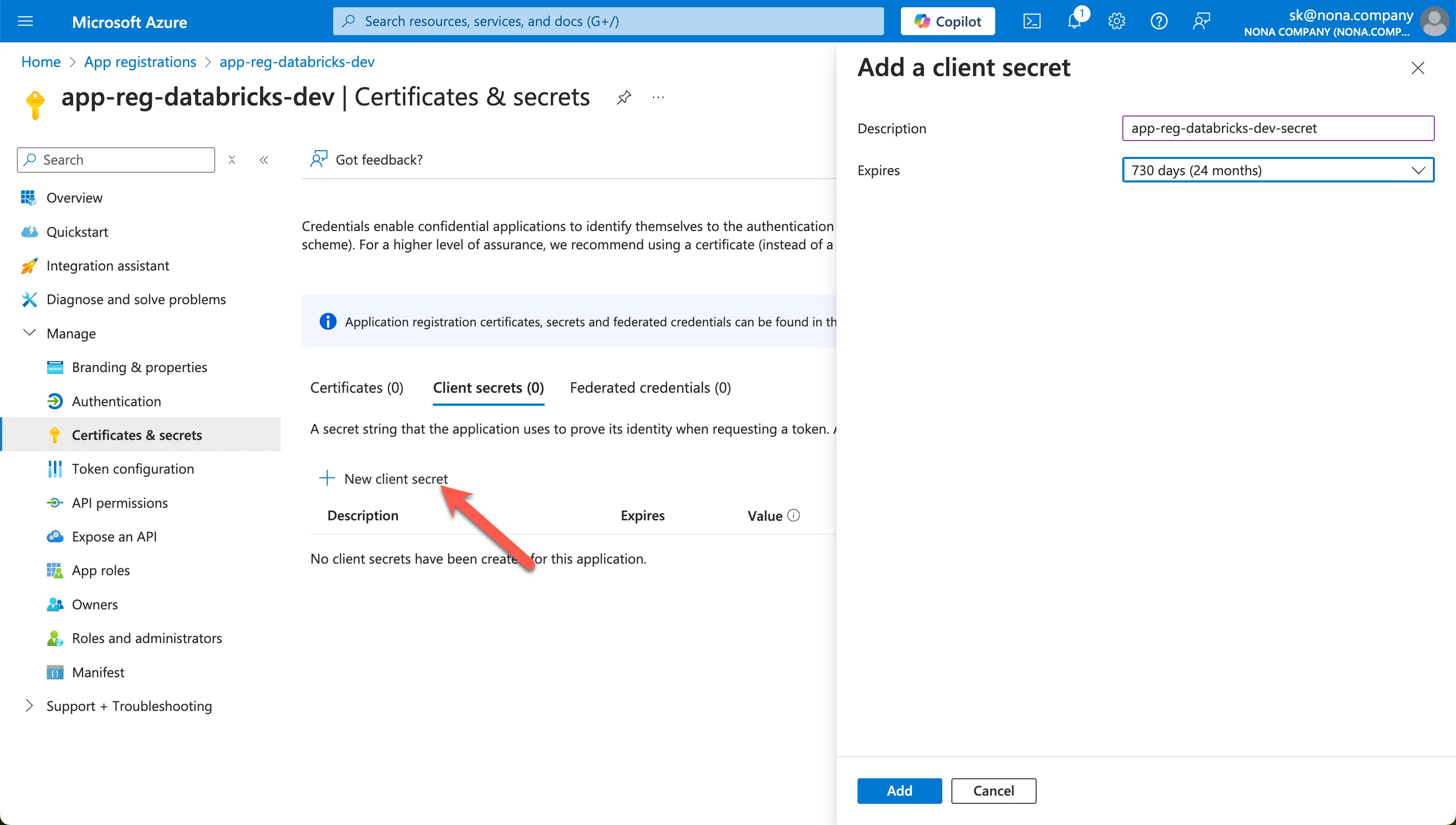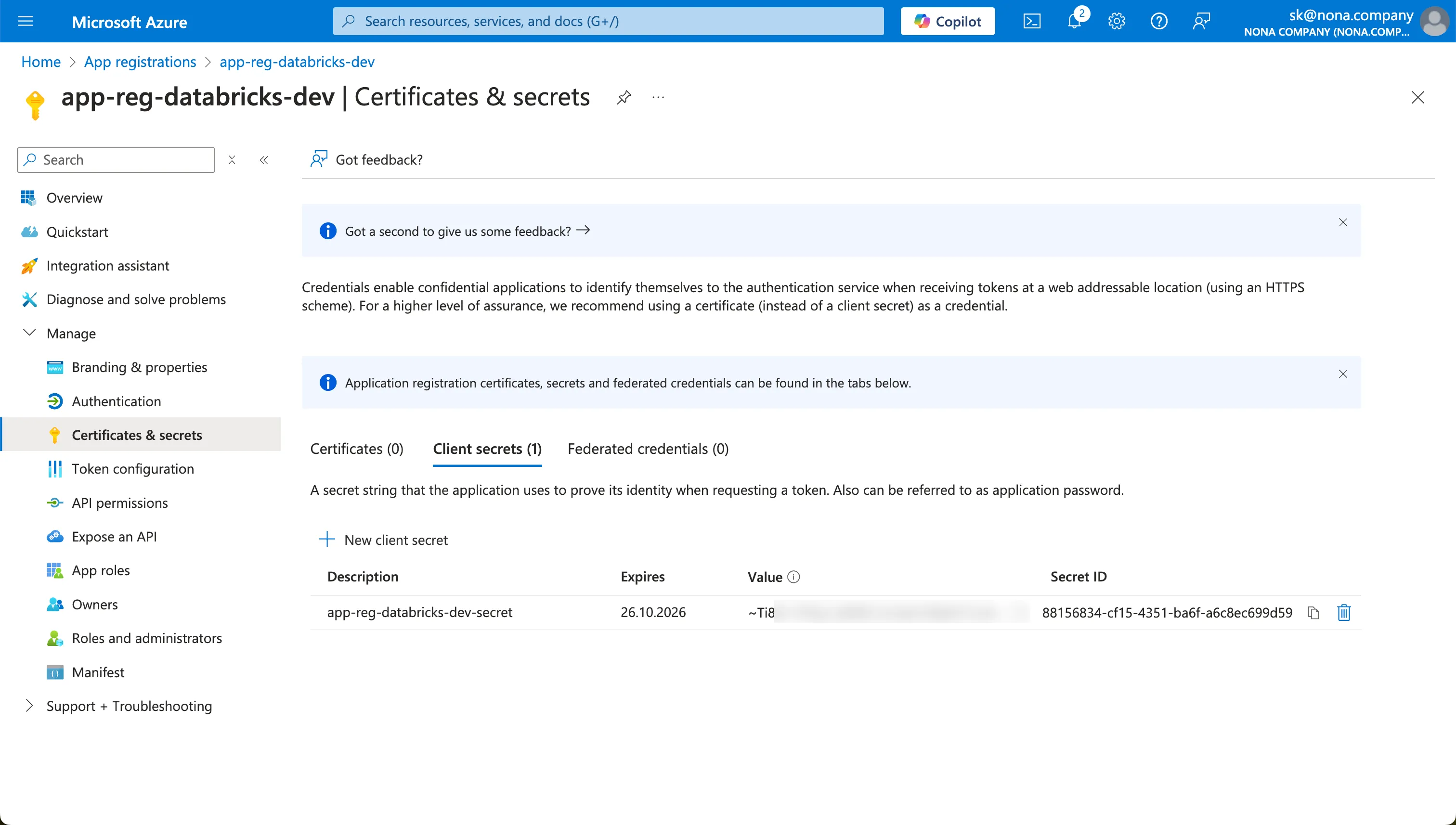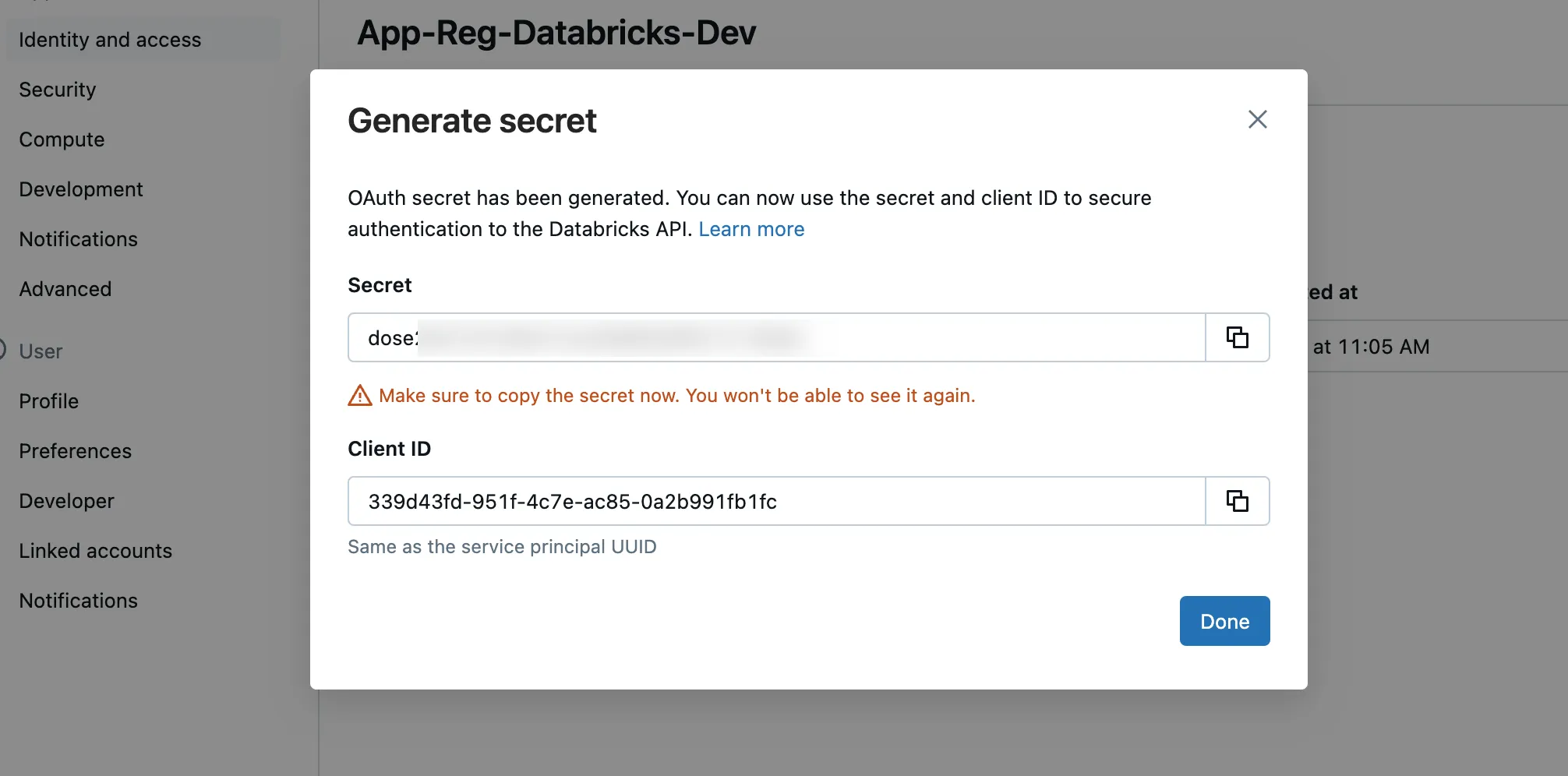 Important: You must add the OAuth Secret from Databricks, not the one generated in Azure!