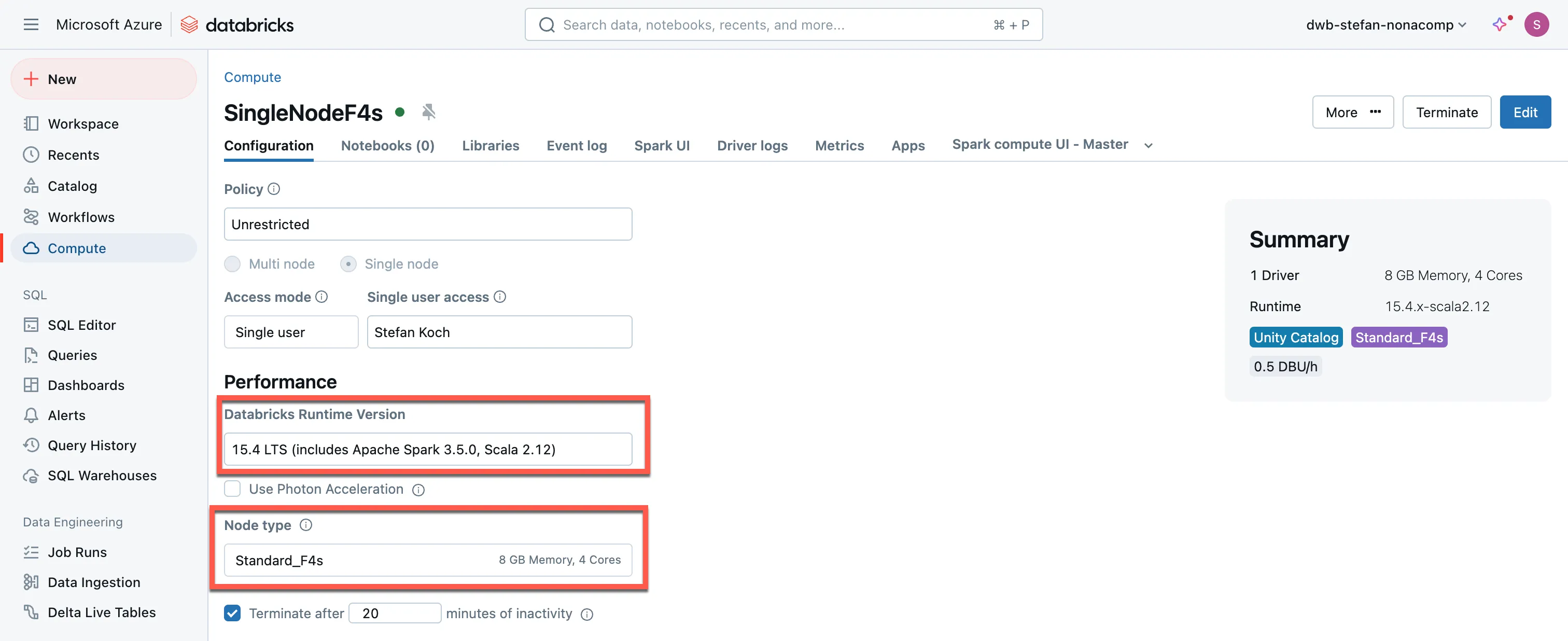 For the Databricks Runtime Version, I chose 15.4 LTS and the Node type Standard_F4s, so it will be cheap to run this cluster.