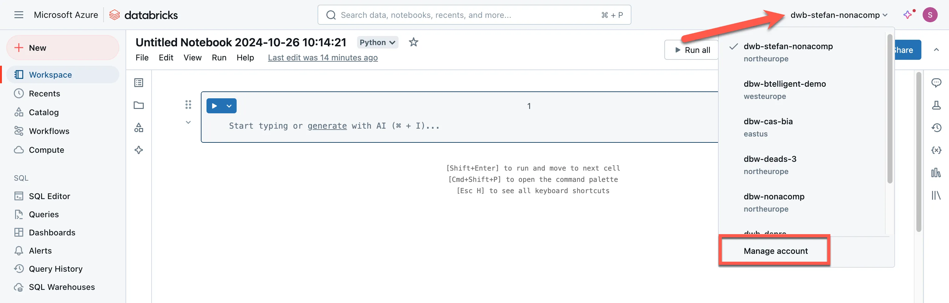 You can find the information you need by logging into your account. You can log in to the account from the workspace, or you can use the URL you already know. Click on the name of the Databricks workspace, and the “Manage Account” option will appear.