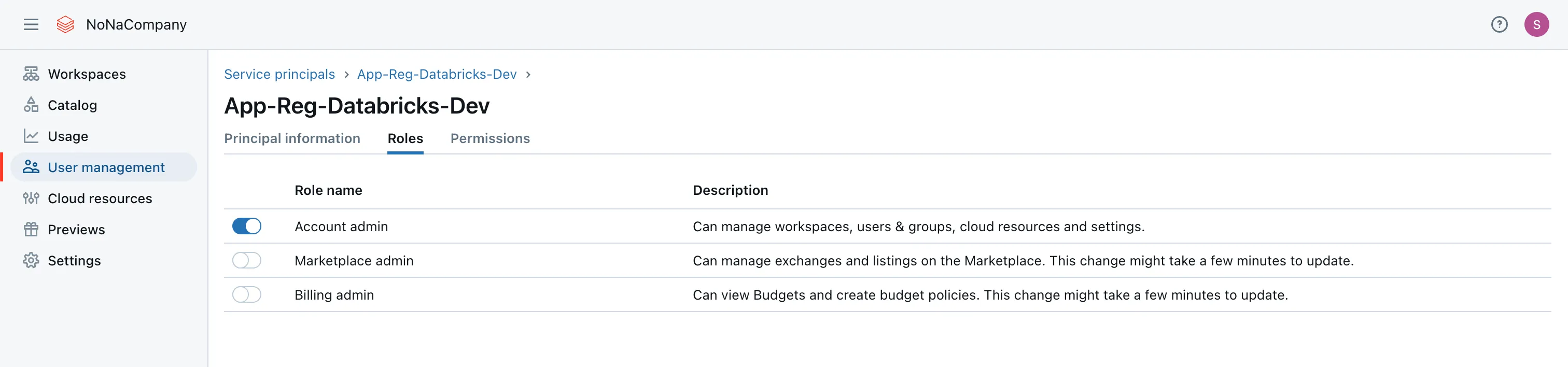 That’s because the Service Principal doesn’t have enough rights. So, I went to the account under User Management, Service Principal, and added the “Account admin” role to the Service Principal.