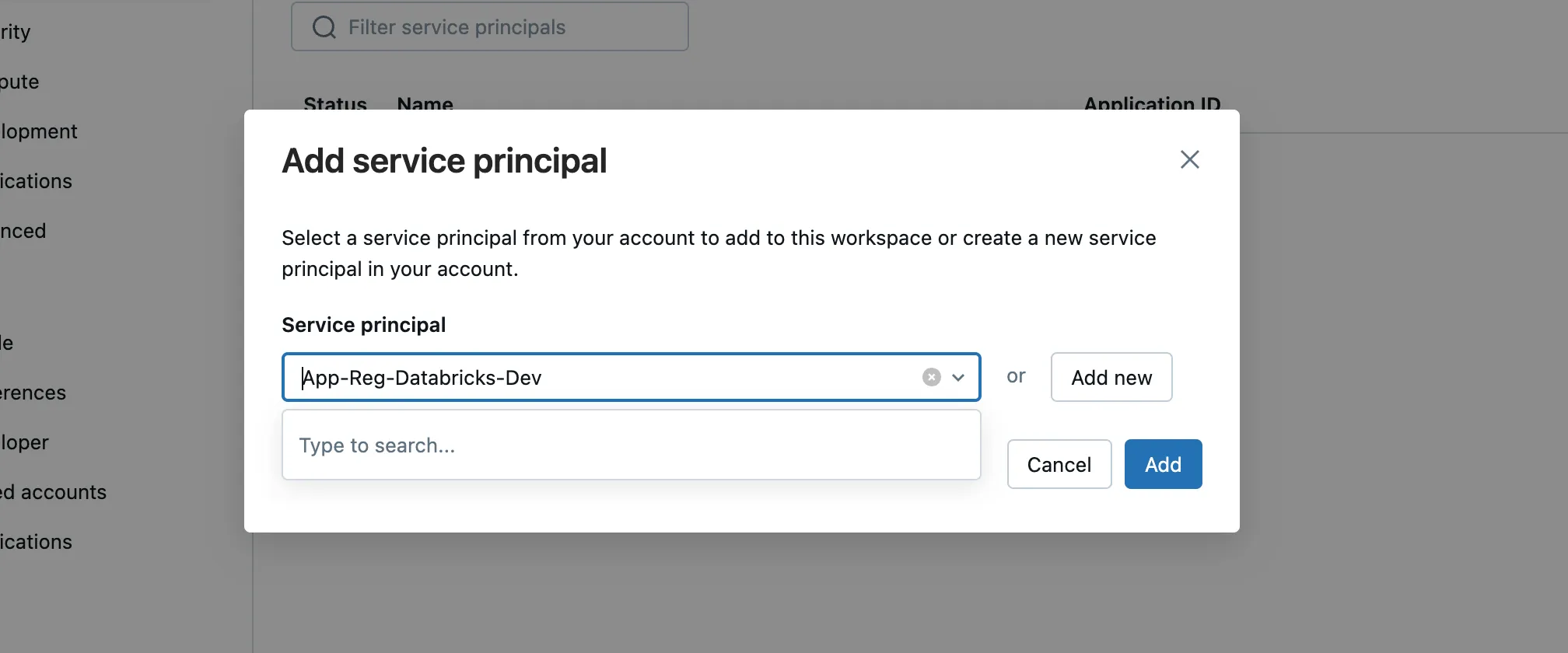 I go to the Databricks account for user management in the next step. I add a new service principal under the “Service principals” tab.