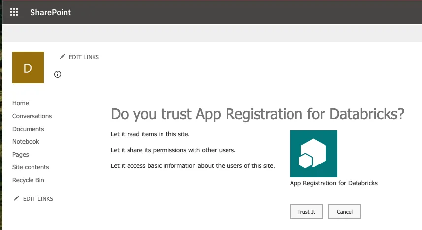 To allow Databricks to access SharePoint, I use an App Registration in Azure – a Service Principal that authenticates against the Microsoft Graph API. This app is granted the necessary permissions (e.g., Sites.ReadWrite.All) to read and write files in SharePoint. Access is handled via an access token used within my Databricks notebooks, with no need for interactive logins or manual approvals. This creates a secure and fully automated connection between Databricks and SharePoint.