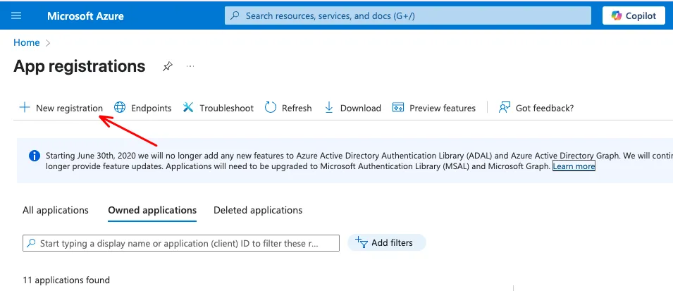 Go to the Azure Portal and navigate to App Registration. Click New registration.