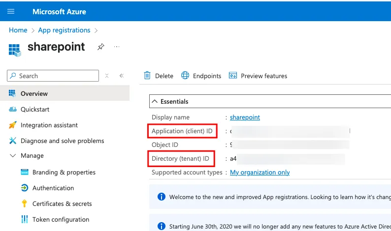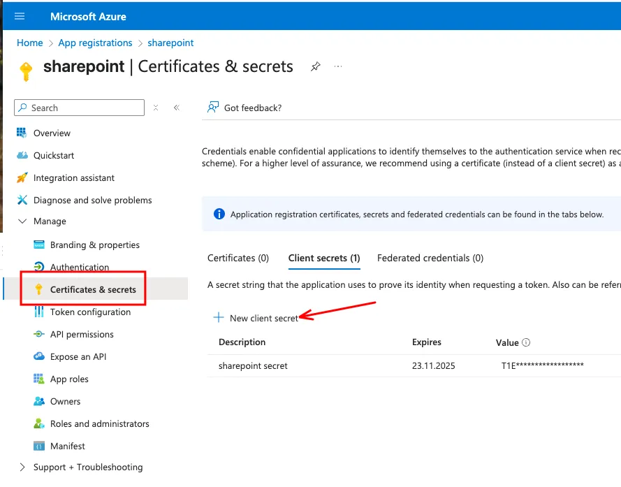 Choose a name (e.g., databricks-sharepoint-access) and keep the default setting for single-tenant access. In my example i called it “sharepoint”. Copy the Application (client) ID and the Directory (tenant) ID to a safe place.