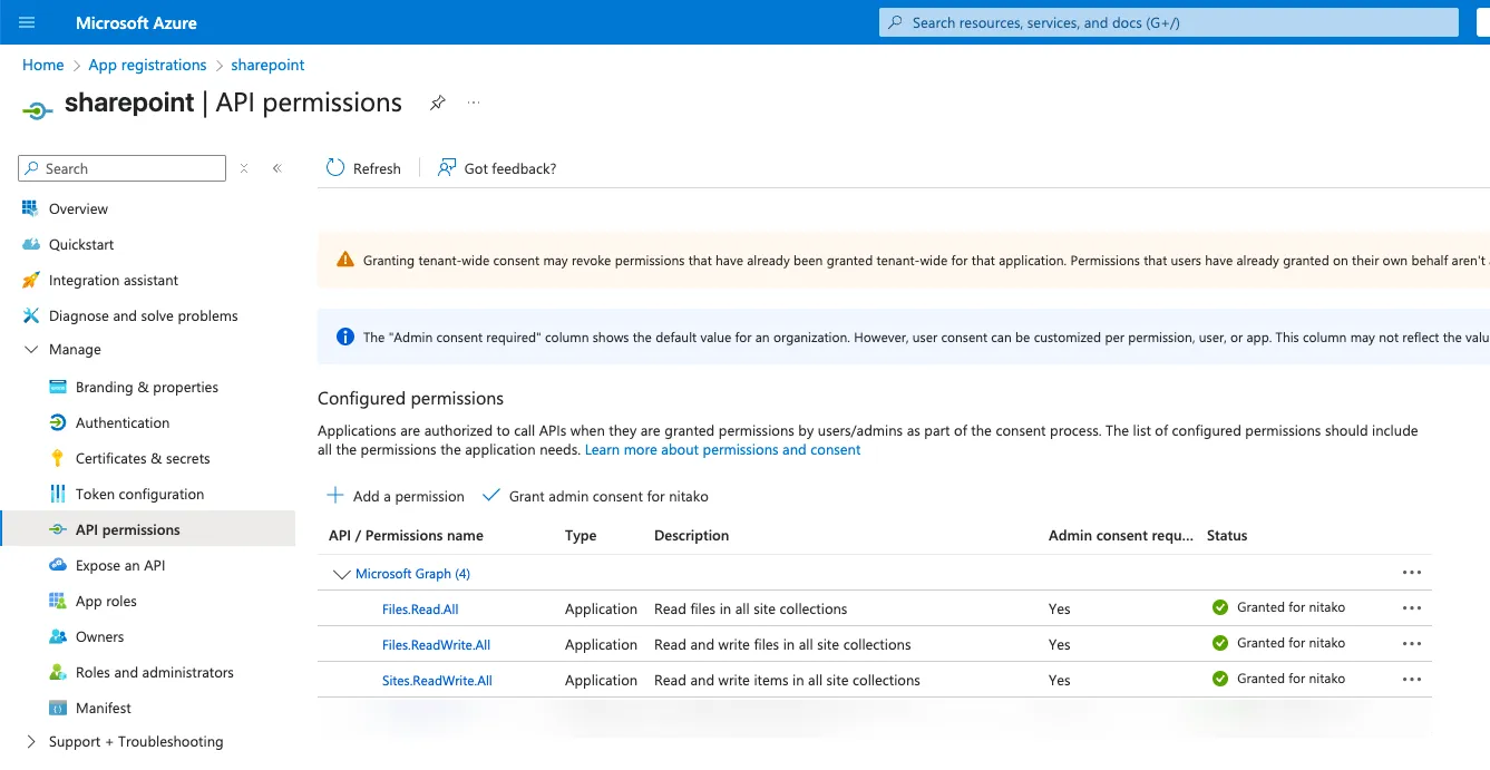To read and write to the SharePoint folder, we need to grant the proper permissions to the App Registration. For this, you set the Permissions on the App Registration. On the App registration, go to API Permissions. For Microsoft Graph, I set the following permissions: