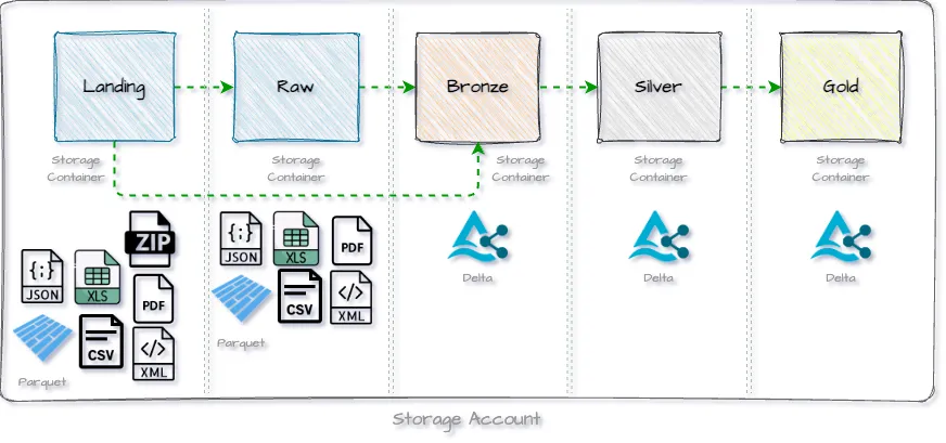 Landing zone: Delivery of files from third-party systems. This zone is transient, i.e. the data is only stored temporarily, processed by the data pipeline and the files are either moved to Raw or only the content is stored in Bronze. After processing, the data in the landing zone is deleted.