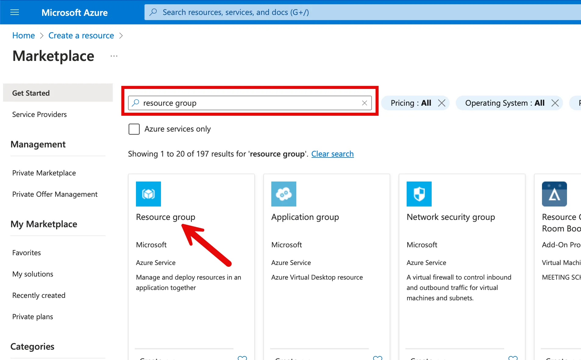 You can search for “resource group” in the search field, where the suggestions are then displayed. Click on the relevant resources to go to the settings.