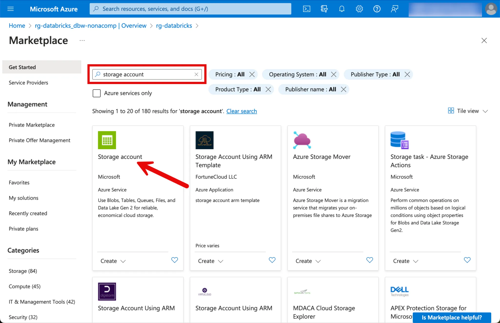 To create the storage account, we switch back to the resource group and click on “Create”.