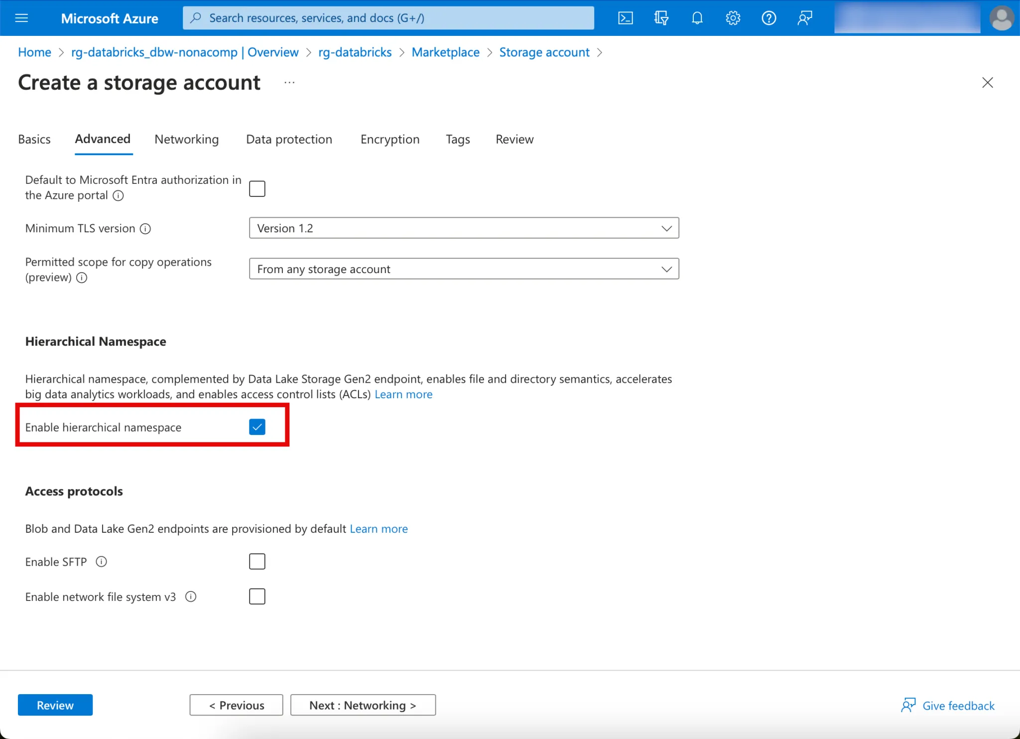🚨🚨🚨 Important: “Enable hierarchical namespace” must be activated! 🚨🚨🚨