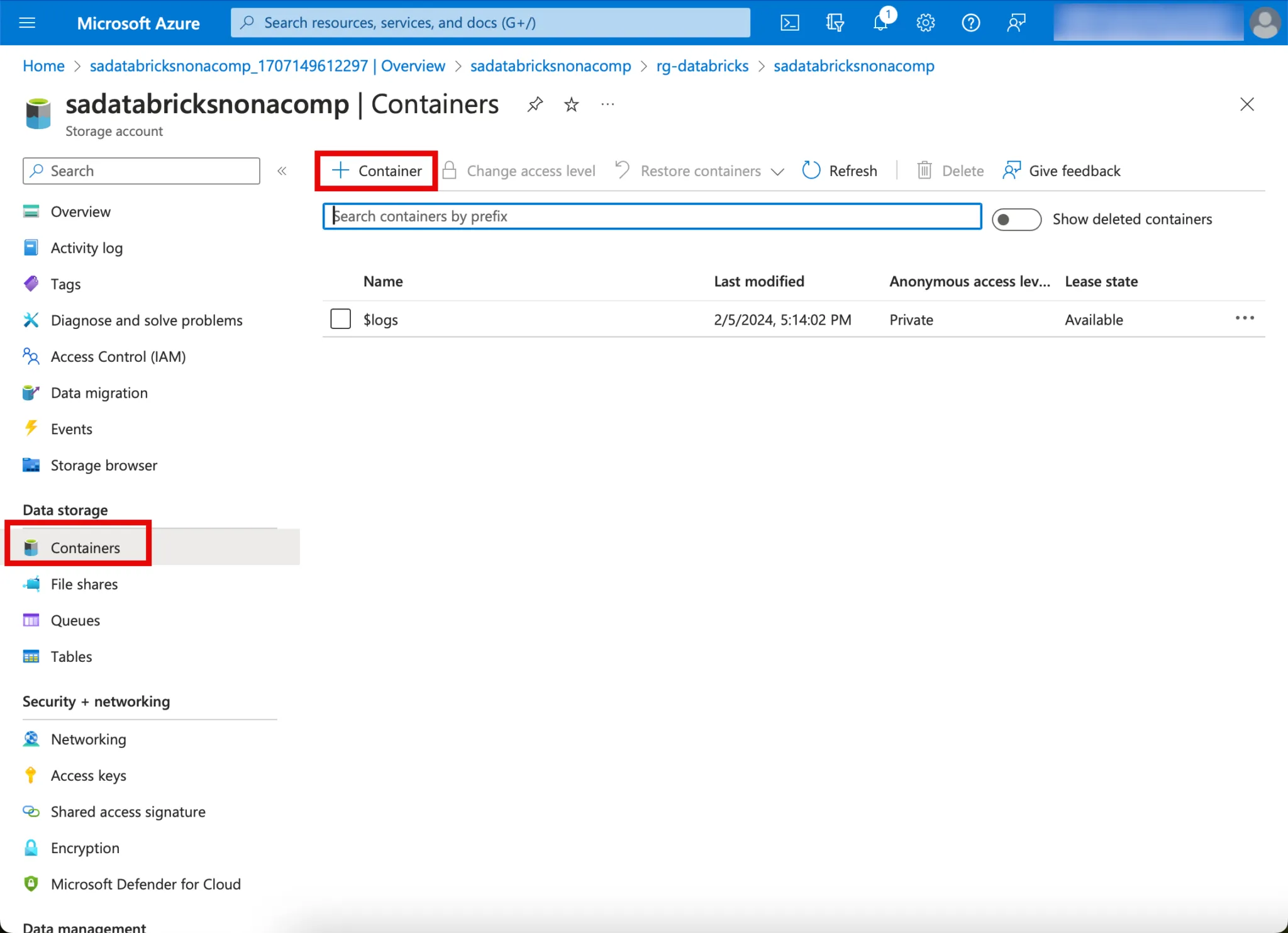 Once the storage account has been deployed, the next step is to create the containers. To do this, you can switch to the “Containers” tab in the context of the storage account.