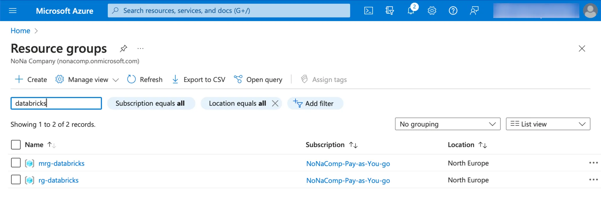 When the Databricks Workspace is created, an additional “Managed Resourcegroup” is created. This contains resources that are automatically created and required for operation. I use a similar name for it as the original resource group by prefixing it with an m, as “mrg-databricks”.