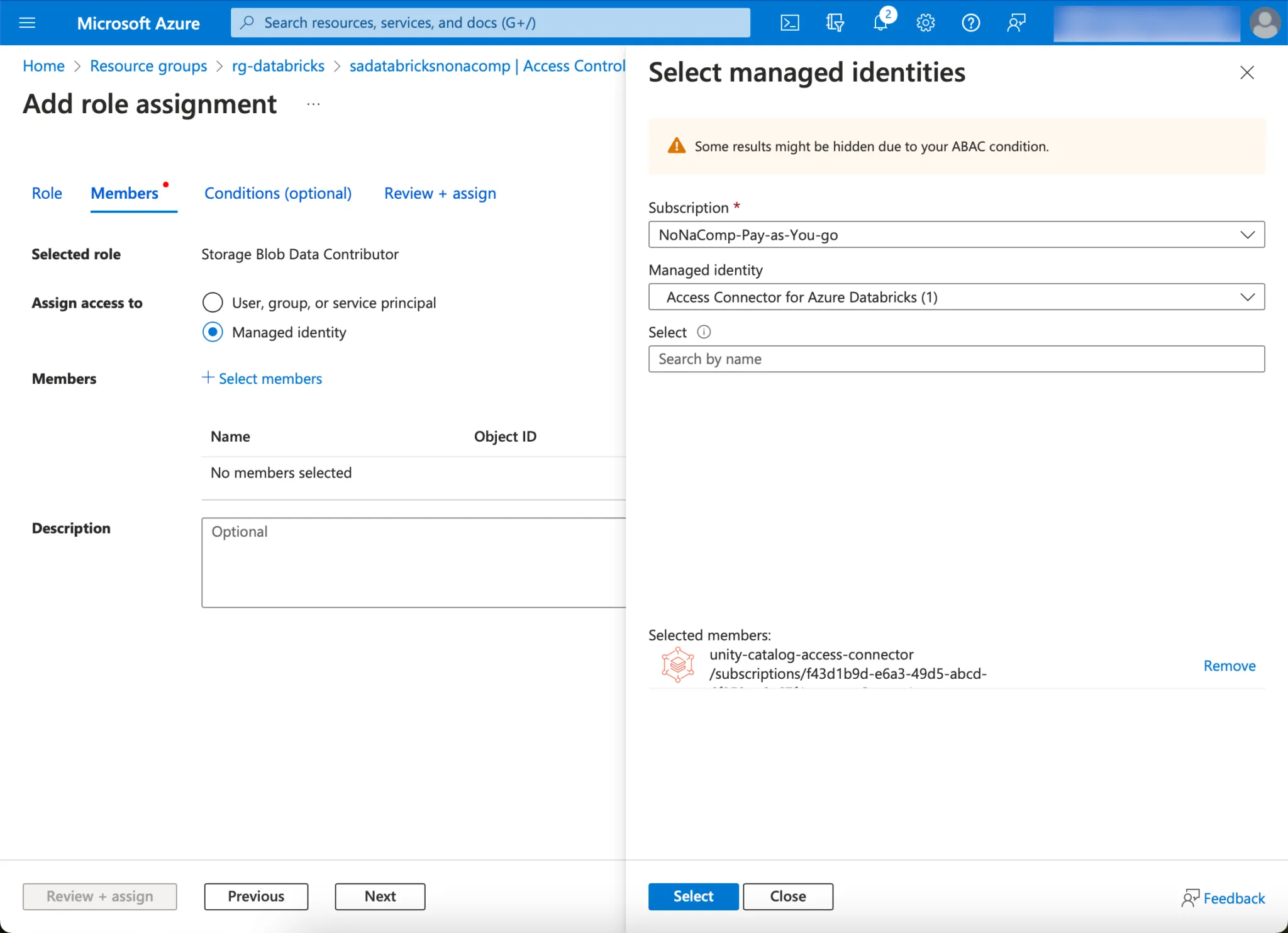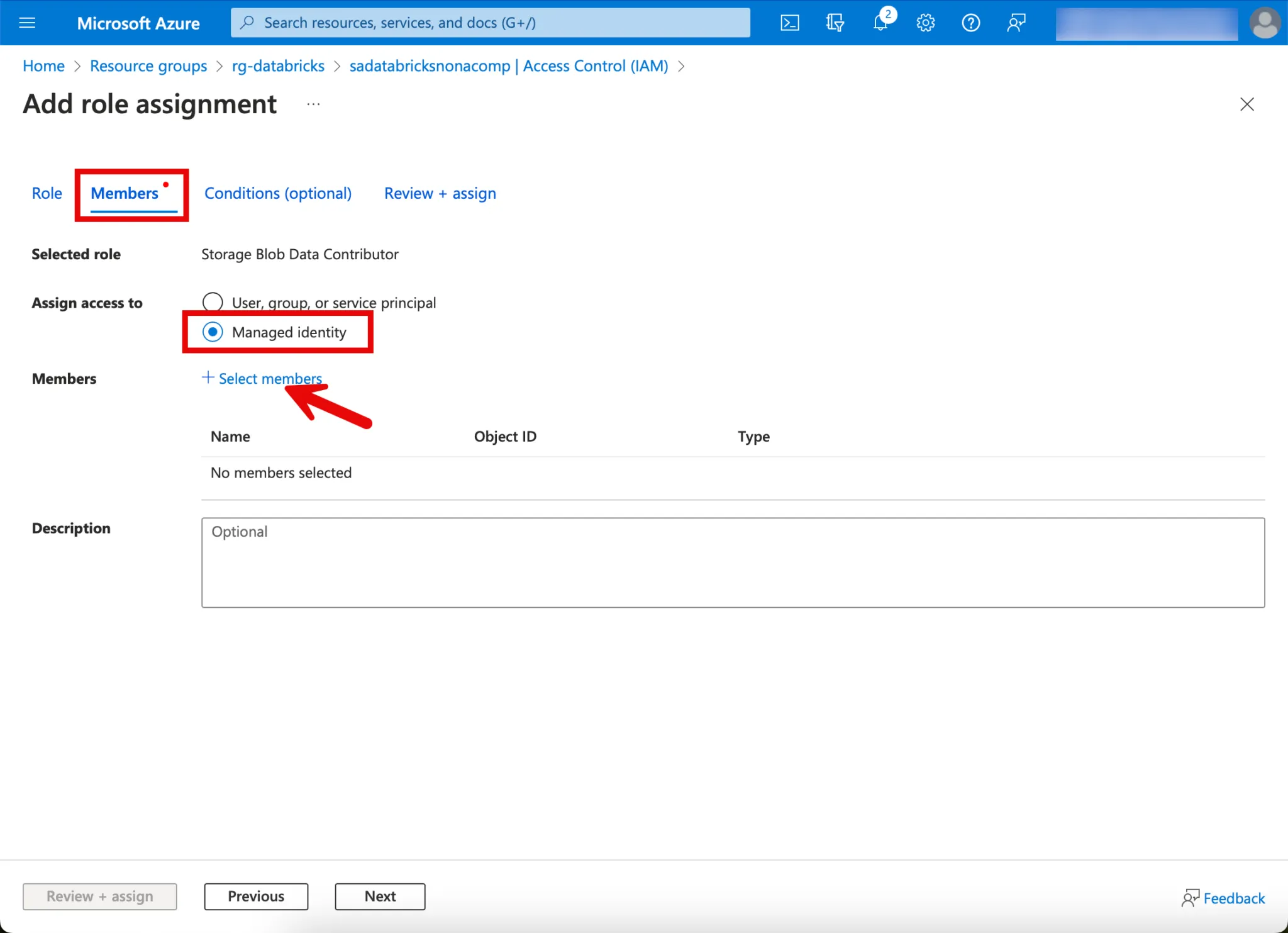 On the Members tab, I click on “Managed Identity”, Select members and search for the Access Connector.