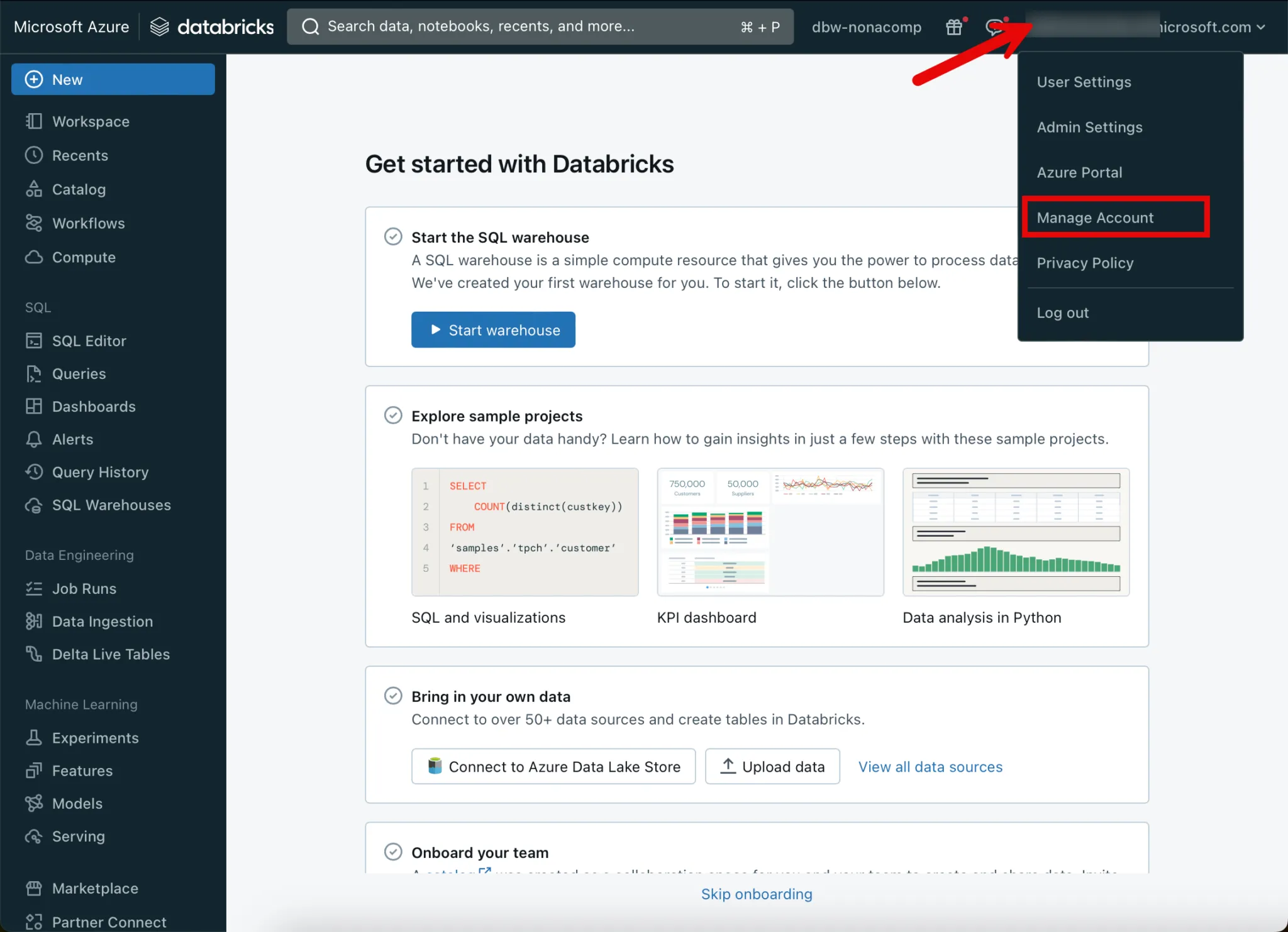 In order to set up Unity Catalog, you must log in to your Databricks account. This is done by clicking on the corresponding menu item of my user.