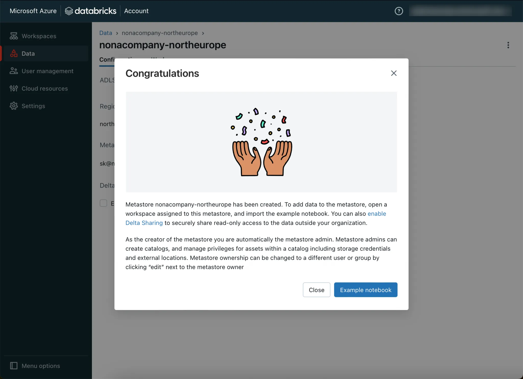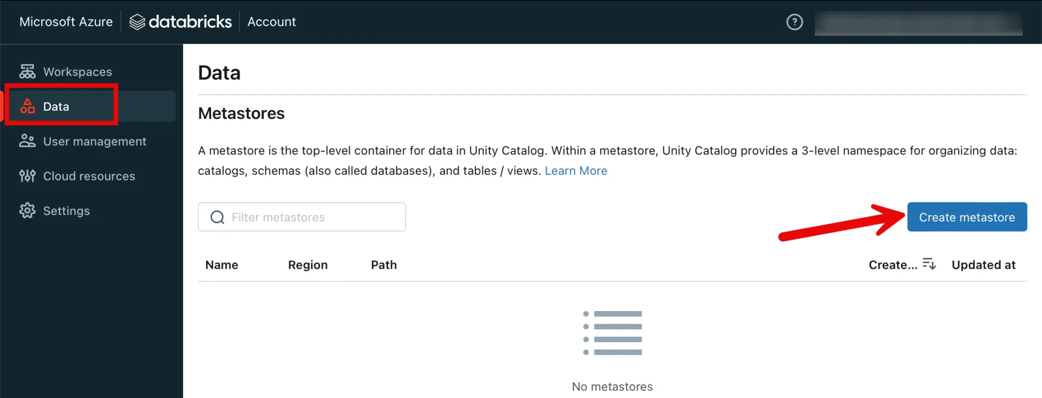 Only one metastore can be created per region. I choose the same region as my Azure resources.