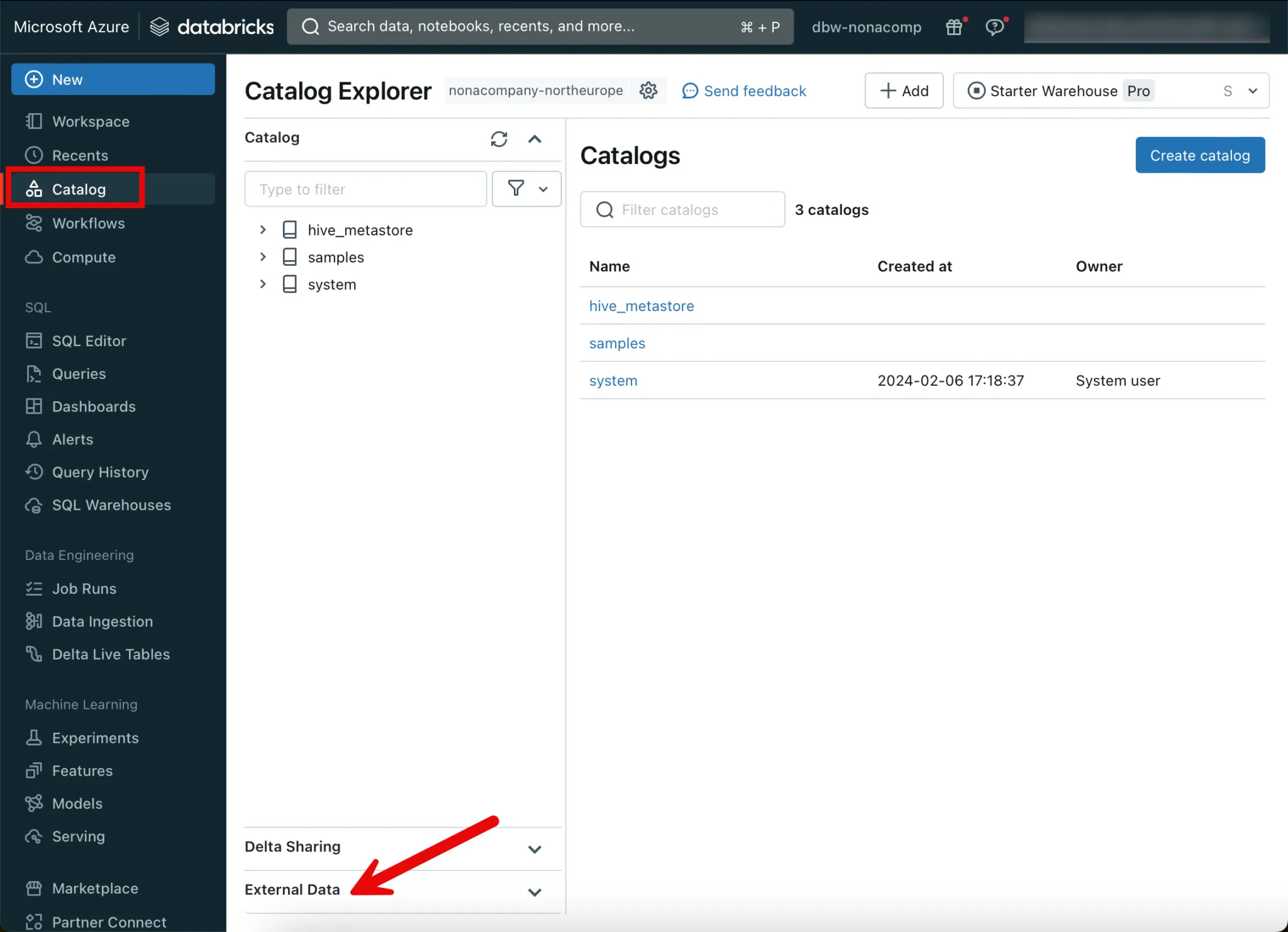 After the metastore has been created, I switch back to the Databricks workspace. To create the catalog objects, I switch to the corresponding menu item. Since I want to set where which objects are located, I will create the corresponding objects in “External Data”.