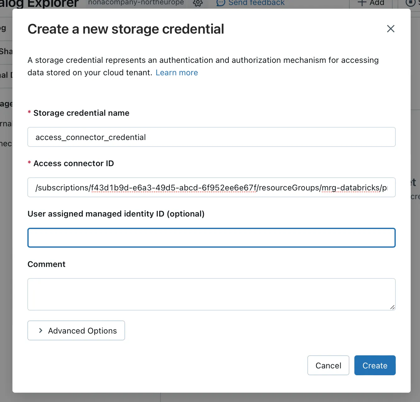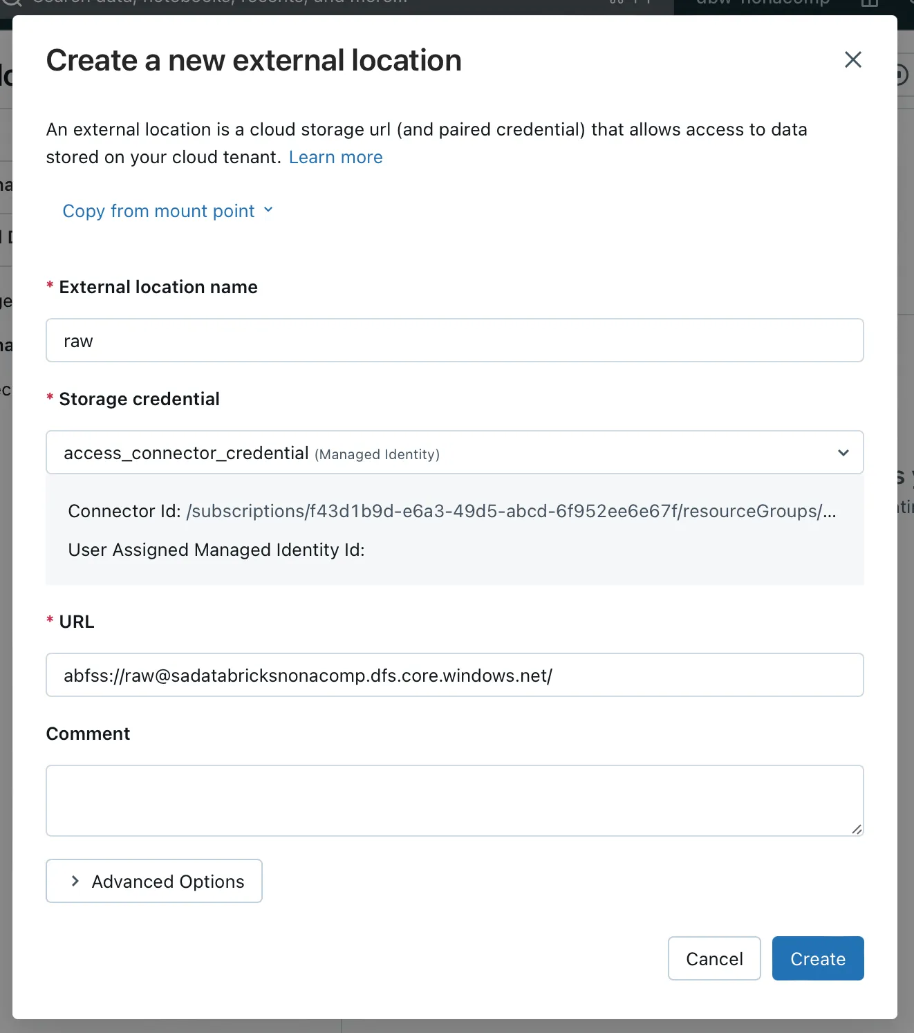 I leave out the path to an ADLS Gen 2 path, as well as the Access Connector id.