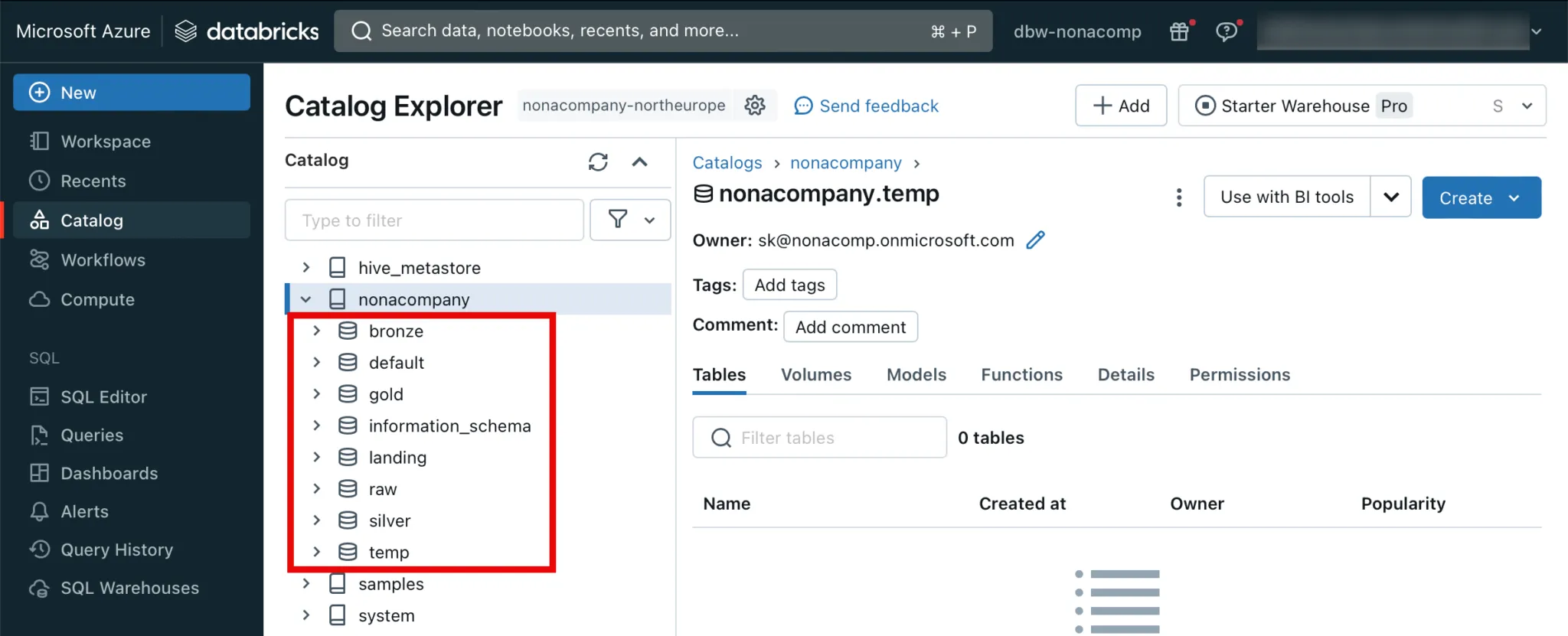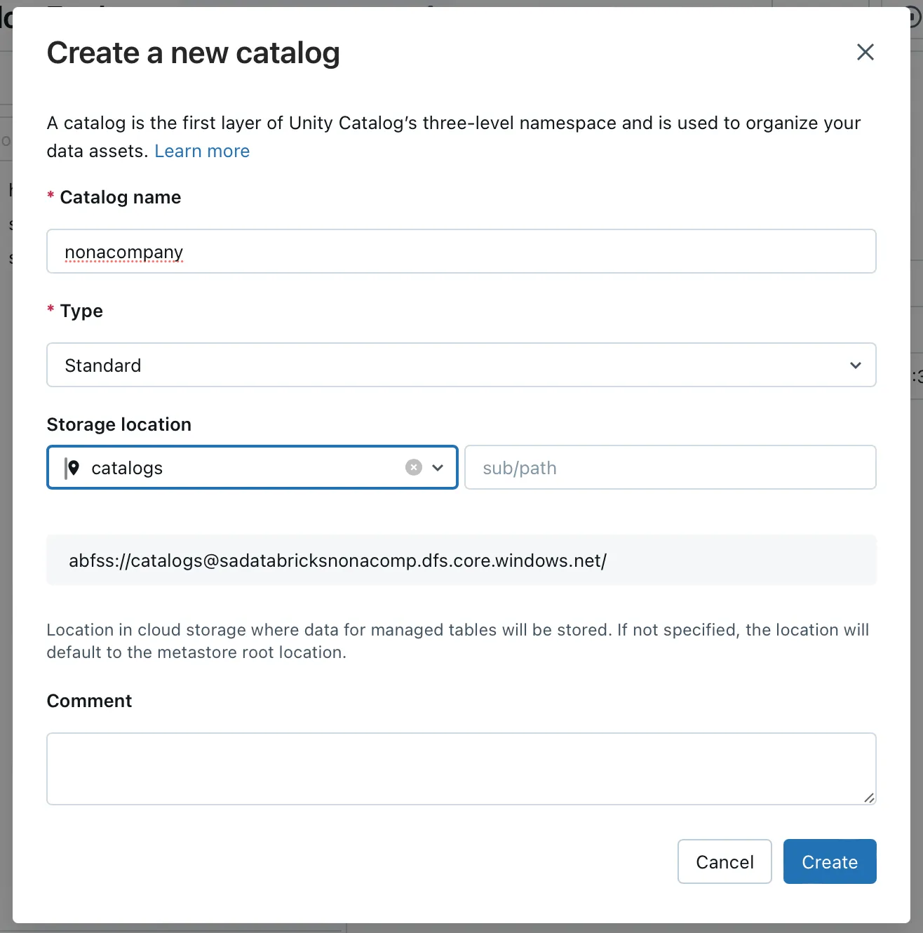 In my example, I will create a catalog. I will name it after my fictitious company NoNaCompany.