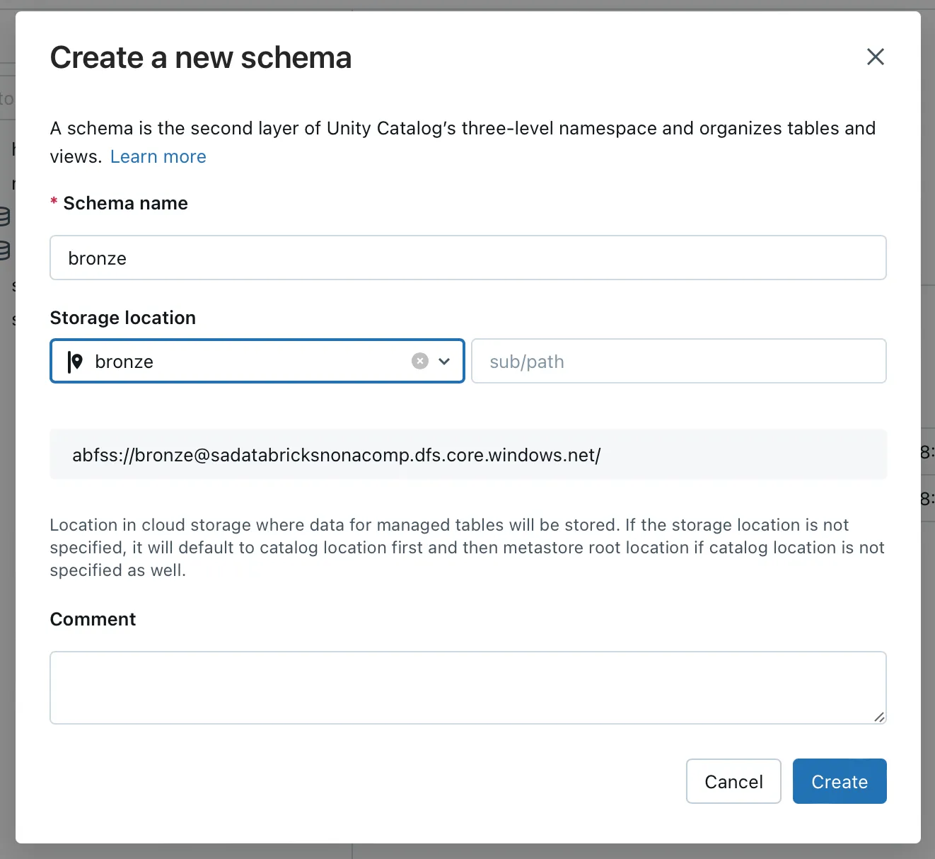 Within the catalog, I now create my various schemas analogous to the zone model, or medallion architecture. I click on the corresponding catalog and then “Create schema”.