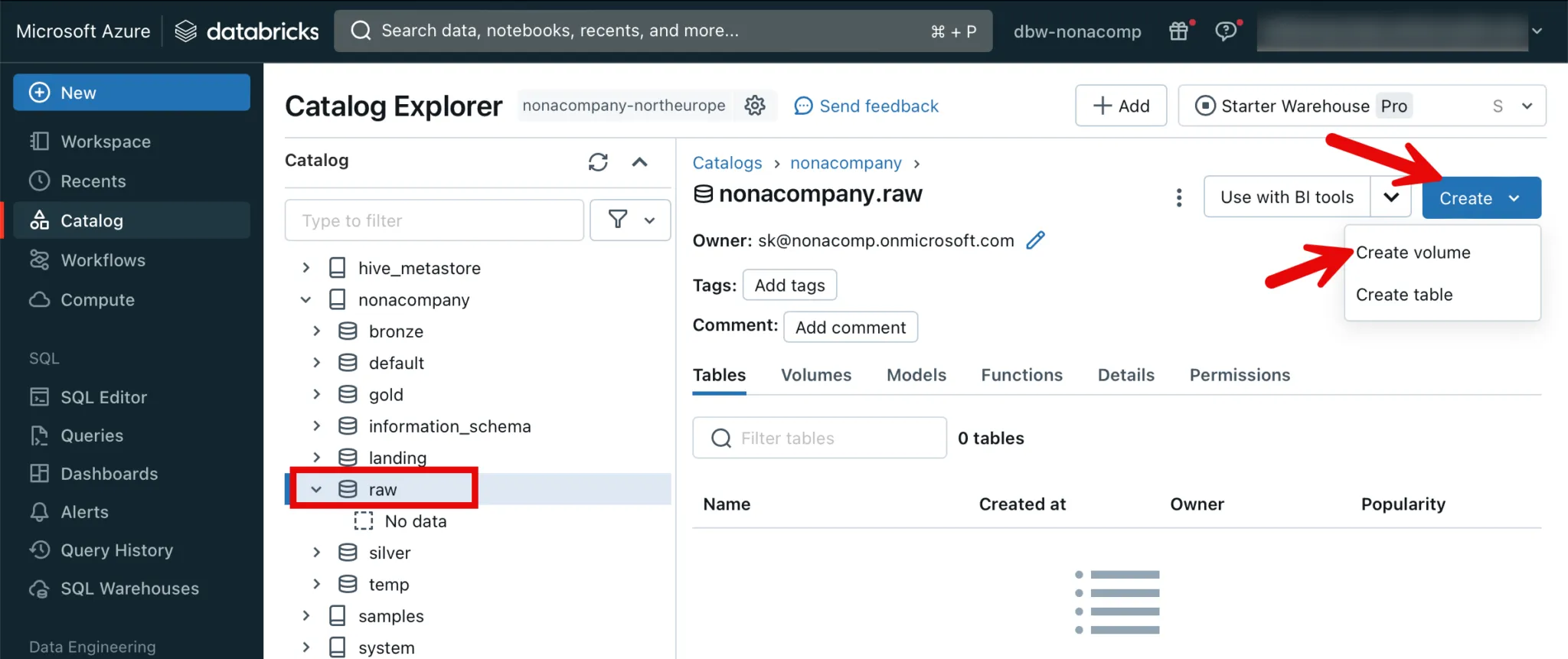 For Raw and Landing, we want to work directly with files that are stored in the Datalake. So that we can access the files directly in Unity Catalog, we use so-called volumes. To do this, I switch to the raw schema. At the top right is the “Create” button, under which a volume can be created.