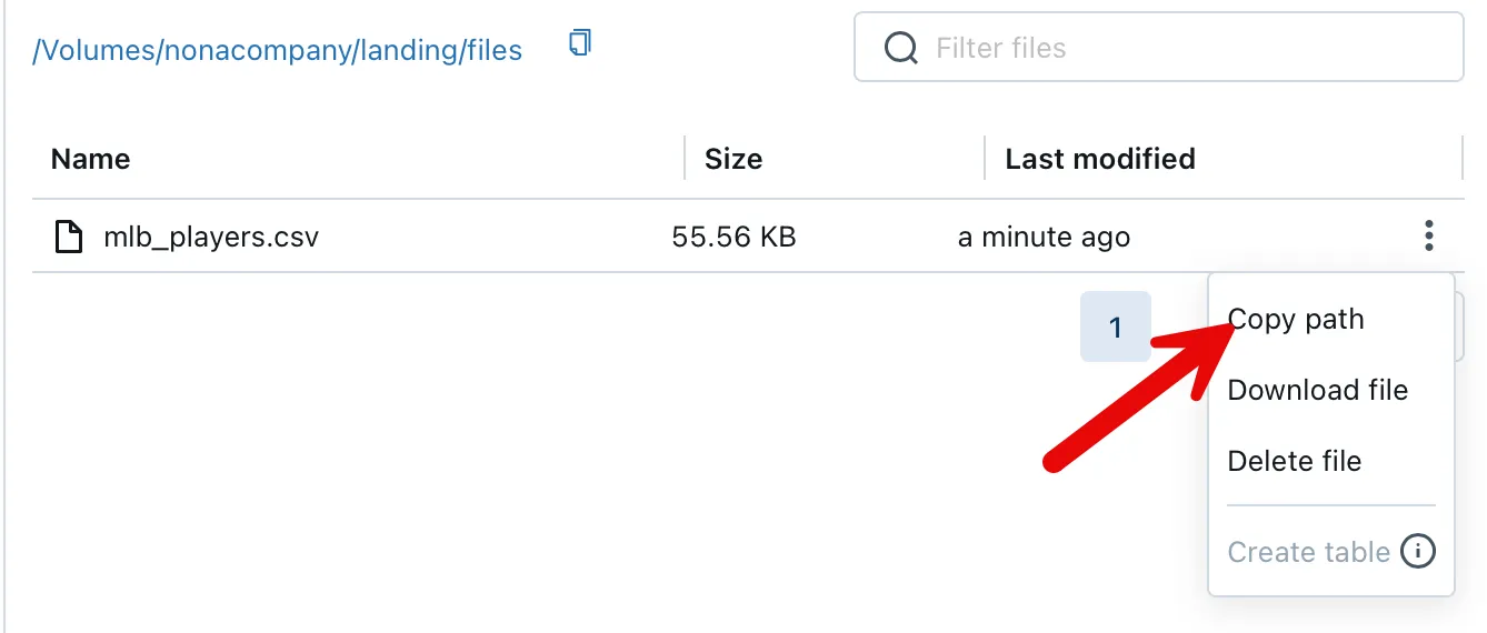 The file can now be accessed via this path: /Volumes/nonacompany/landing/files/mlb_players.csv