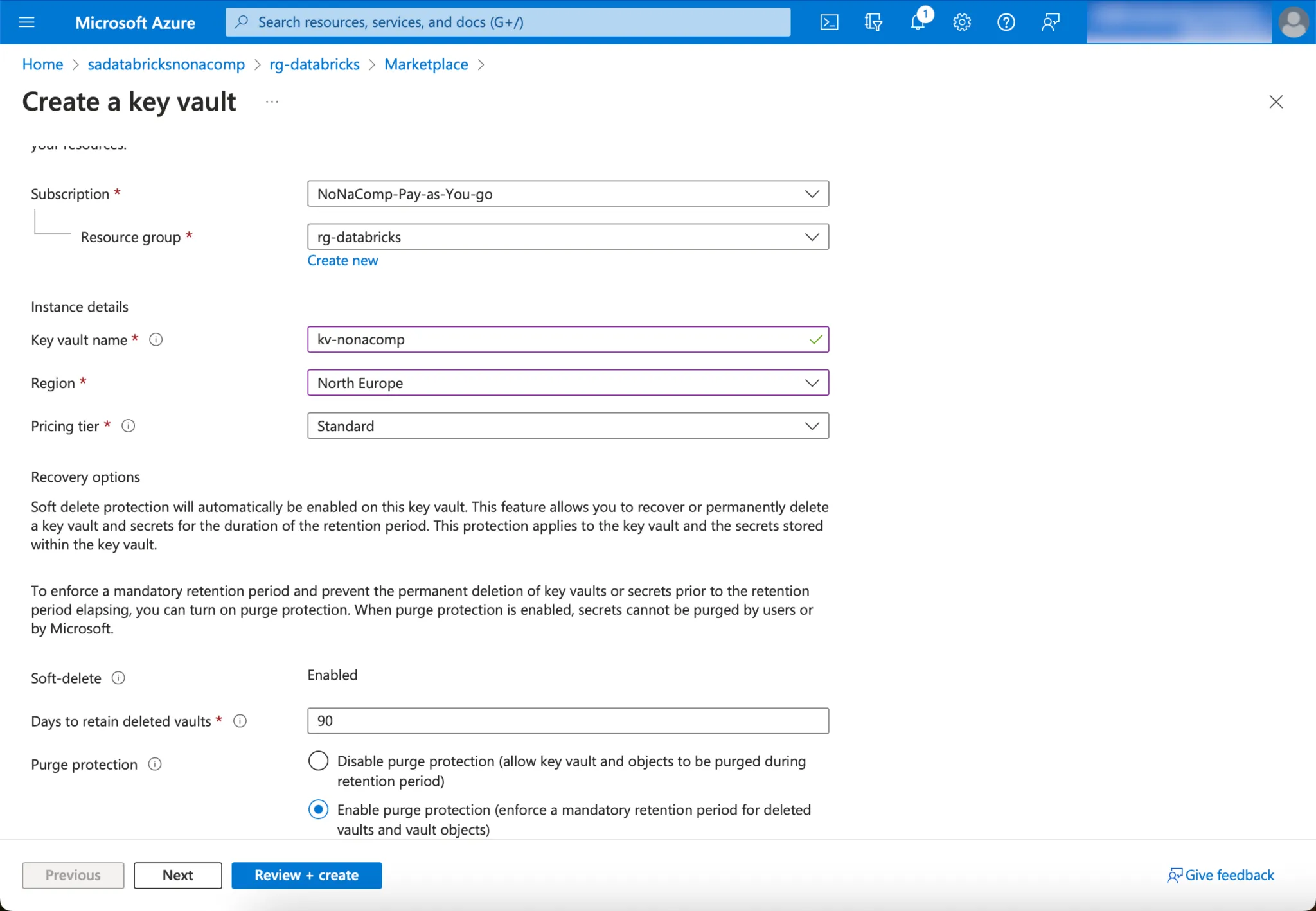 For the workspace name, I assign a meaningful name accordingly. I have an example of a fictitious company “NoNameCompany”, which I abbreviate to “nonacomp”. As already mentioned, I select the region in the same way as the resource group.