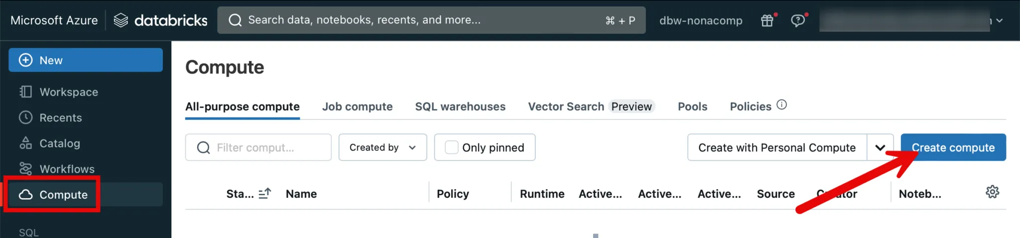 Clusters are a central component of Databricks Lakehouse. I create a simple cluster by switching to the “Compute” menu item in Databricks.