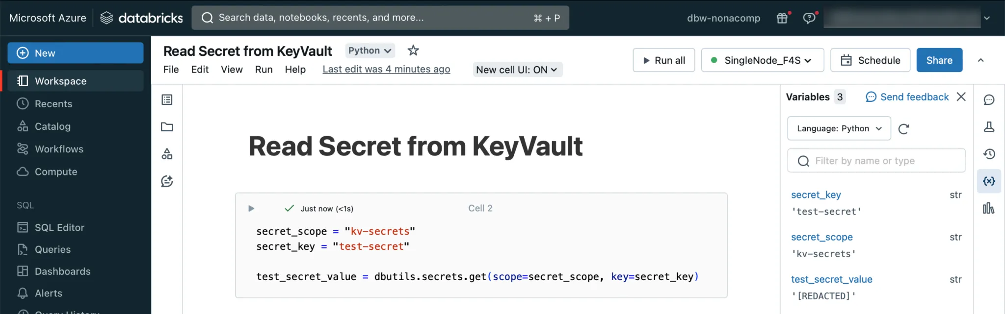 Within the Databricks workspace, I create a notebook in which I integrate the test secrets.