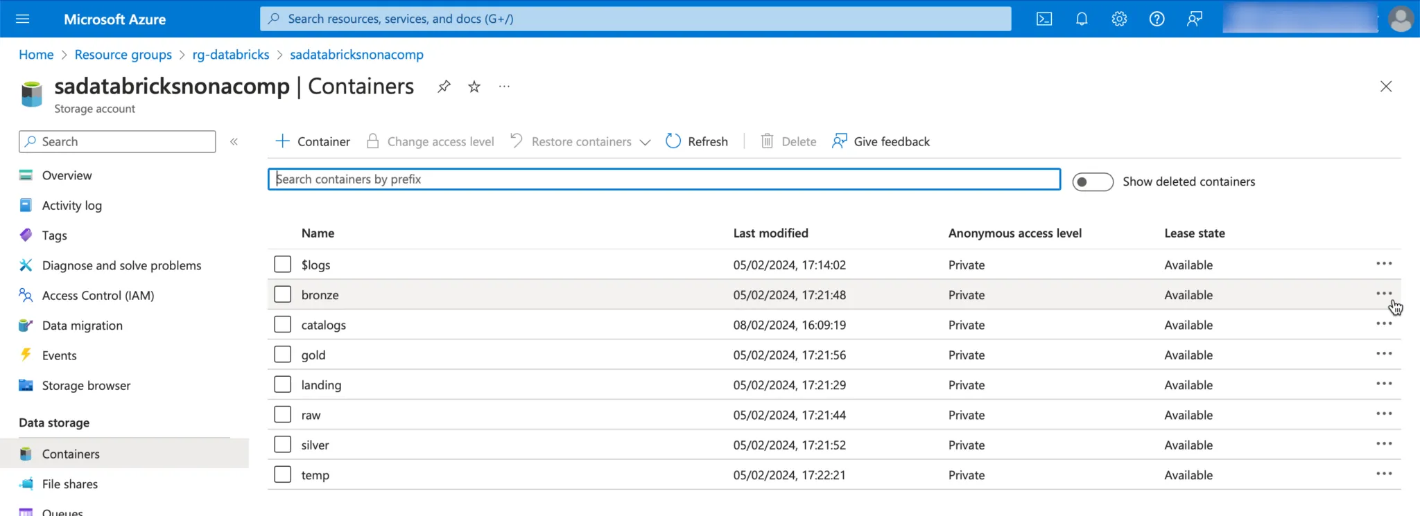 This step is repeated for all containers. In addition to the zones mentioned, I also create a “temp” container and a “catalogs” container. temp, as the name suggests, is used for temporary objects. I use the catalogs container to make these available as storage for the catalogs in Databricks.