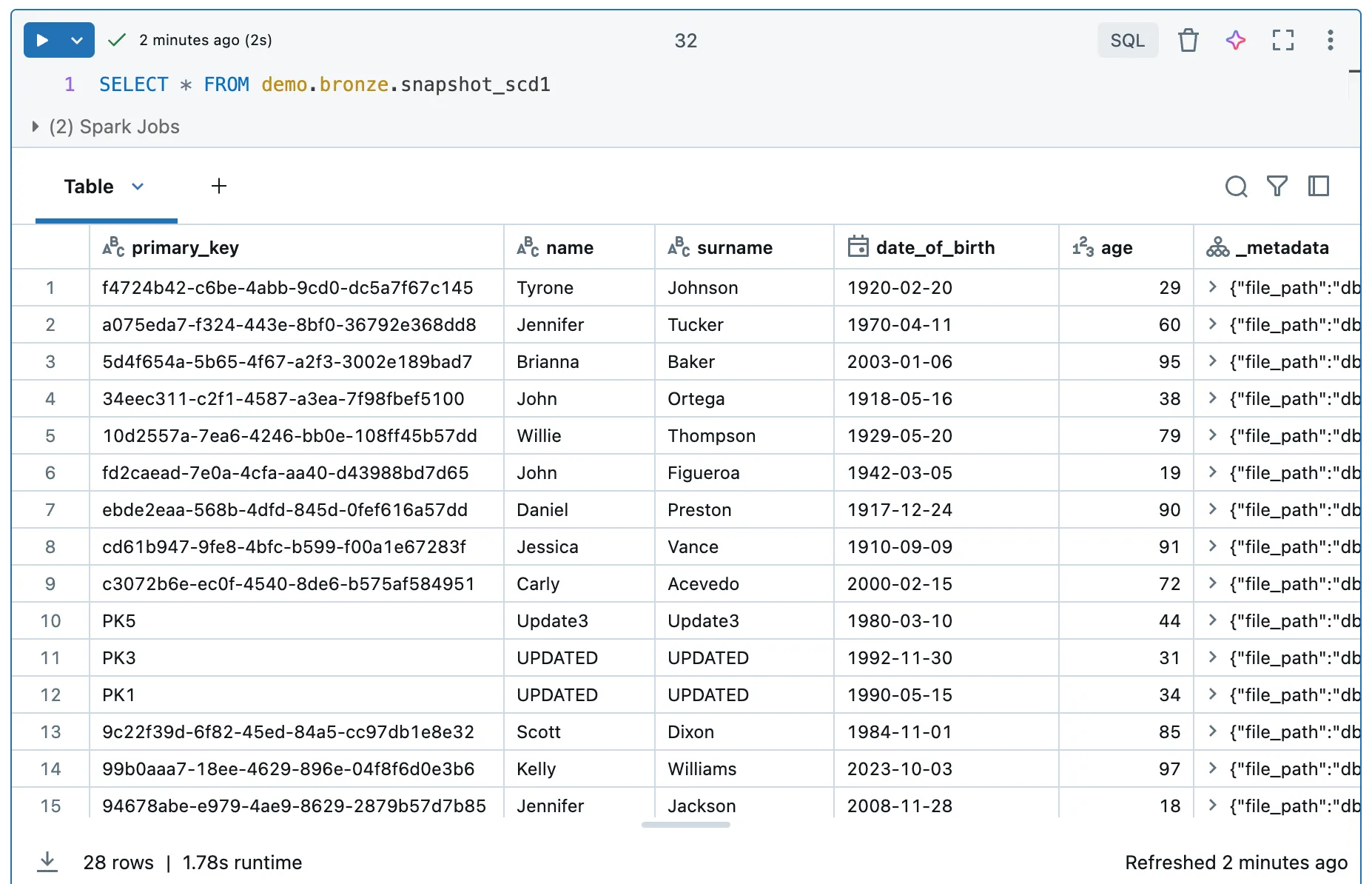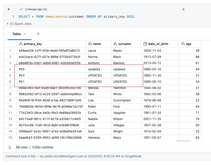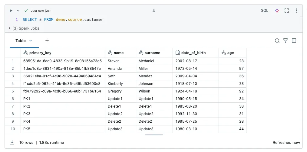 df_customer_delta = spark.createDataFrame(data, ['primary_key', 'name', 'surname', 'date_of_birth', 'age'])
