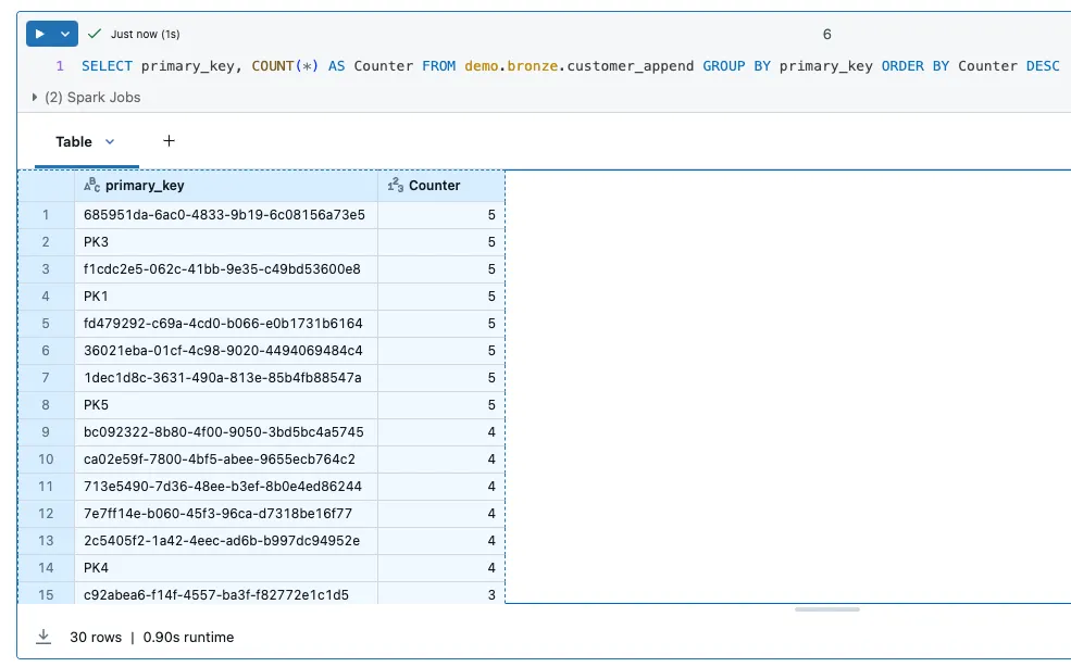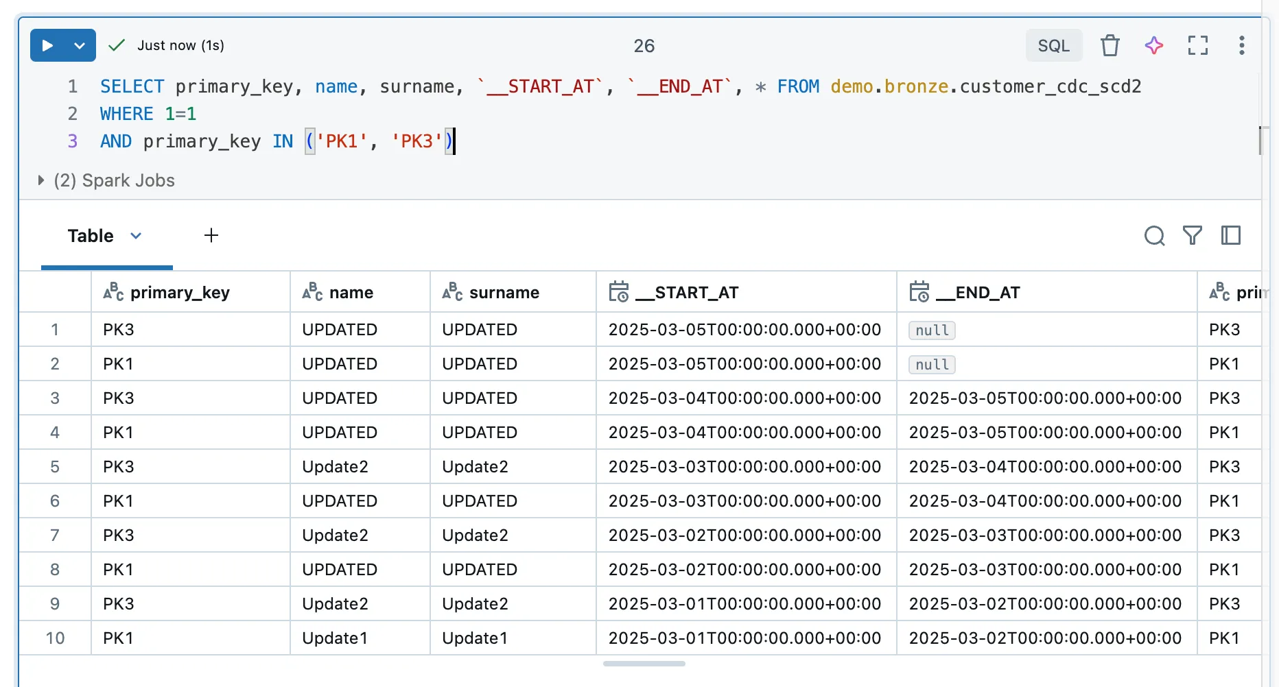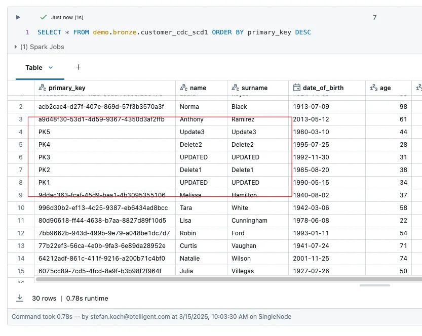 Instead of several steps, this new streaming table can process the data directly. Since we have SCD1, it is a current image of the source table and we do not find any information about the history.