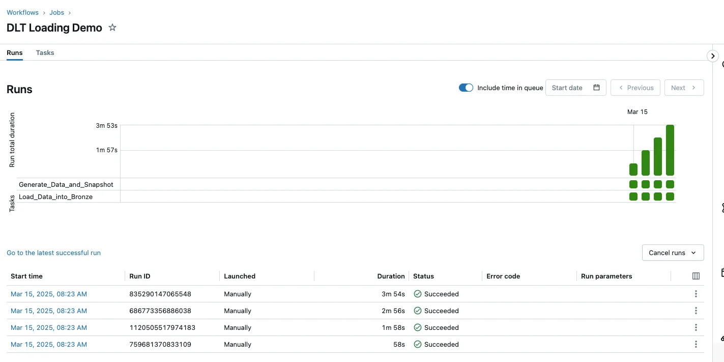Apply Changes From Snapshot SCD2: Here I have the complete historisation including delete detection. The ingestion is a bit more complex because you can’t use autoloaders, but the result is a single bronze table.