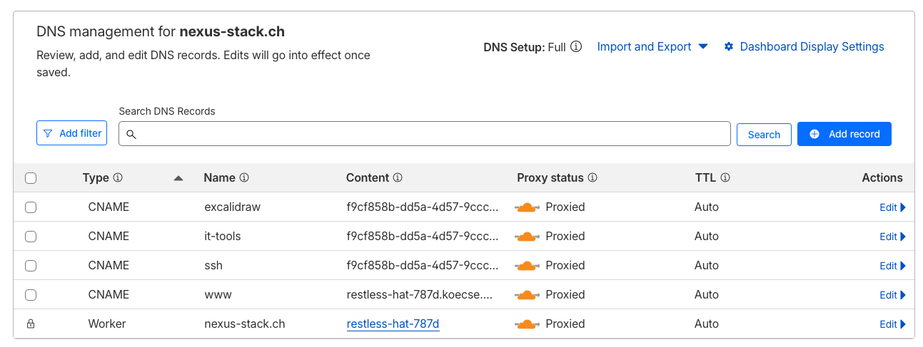 In Cloudflare, you can see the corresponding DNS entries that were automatically created. Each Docker container has its own CNAME record for the subdomain.