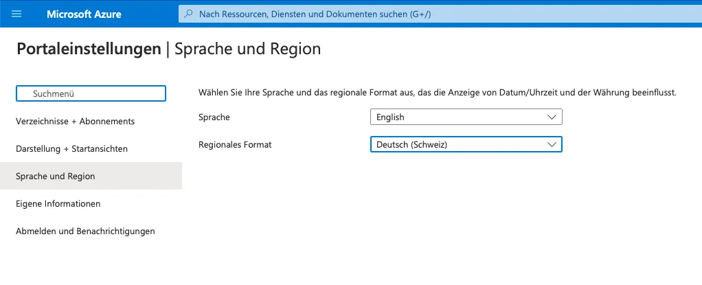 When I create a new Azure environment, I always change the settings first. My native language is German and this was automatically recognized. However, it is advisable to change the language to English. This makes it easier later when researching certain things. The forums and help pages are usually in English and you can access the relevant resources and settings more quickly. Some of the translations from English are not entirely clear. Or you can’t find help on non-English pages. The Azure Portal settings can be changed here: