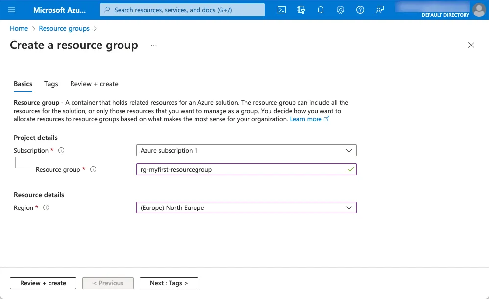 Each resource group has a subscription. As I only have one in this account, the selection is easy. A descriptive name should also be set. The choice of region is based on various criteria: Location and price. On the one hand, I choose a region that is as close as possible to my location in order to achieve low latency. On the other hand, I want to deploy the cheapest possible resources. Depending on the region, there are different prices for the same resources. Although I live in Switzerland, I usually choose Europe North or Europe West because the prices there are a little lower than in the Swiss Azure locations. Further details can be found here: