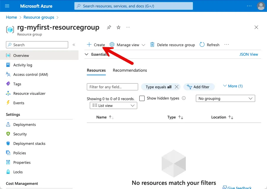 I can then create the resources within the resource group by clicking on the “Create” button.