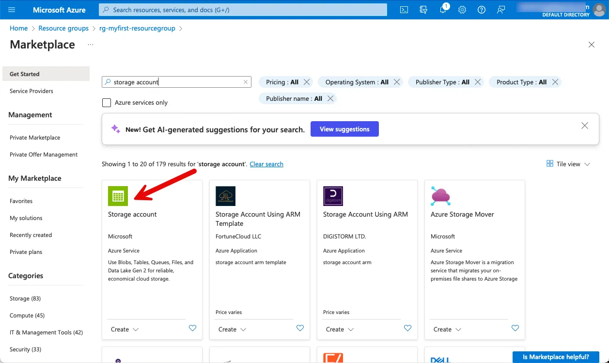 You are then taken to the Marketplace, where you can choose from a variety of resources. In my example, I create a storage account.