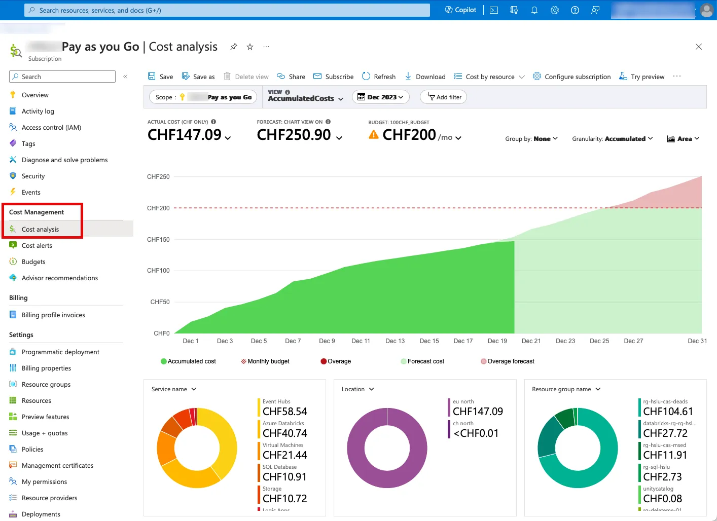 To ensure that costs do not get out of hand, you should always look at the current costs so that you know which resources are causing how many costs. Based on this, you can consider optimizing certain resources. The list of the corresponding costs can be viewed on the subscription itself.
