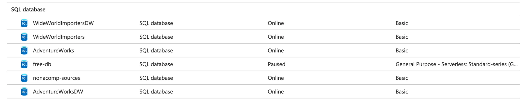 I have set up a sample environment in Azure for my students in which they can practice with the sample databases from Microsoft. The sample databases are stored in different Azure SQL databases. There are 4 databases in total: